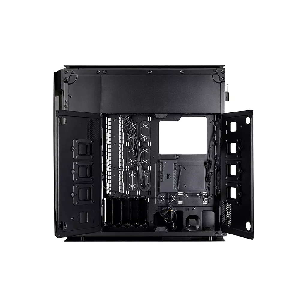 Встроенный вентилятор CORSAIR Commander PRO и контроллер освещения обеспечивает отличный контроль почти над каждым аспектом вашей системы с помощью программного обеспечения CORSAIR iCUE. входит в комплект задний отсек в стиле французской дверцы, материнская плата E-ATX и лоток для материнской платы Mini-ITX двойного назначения и крышка блока питания.