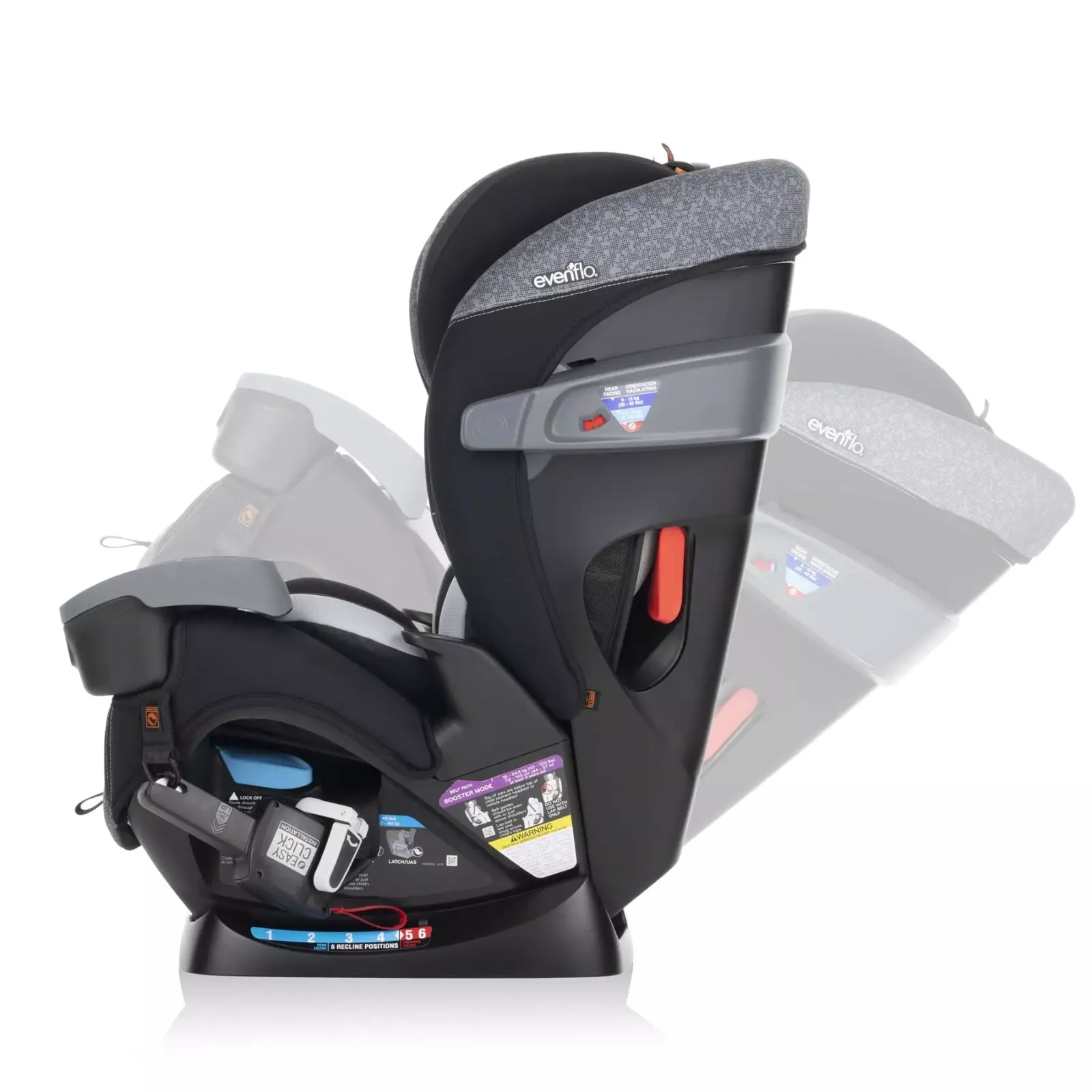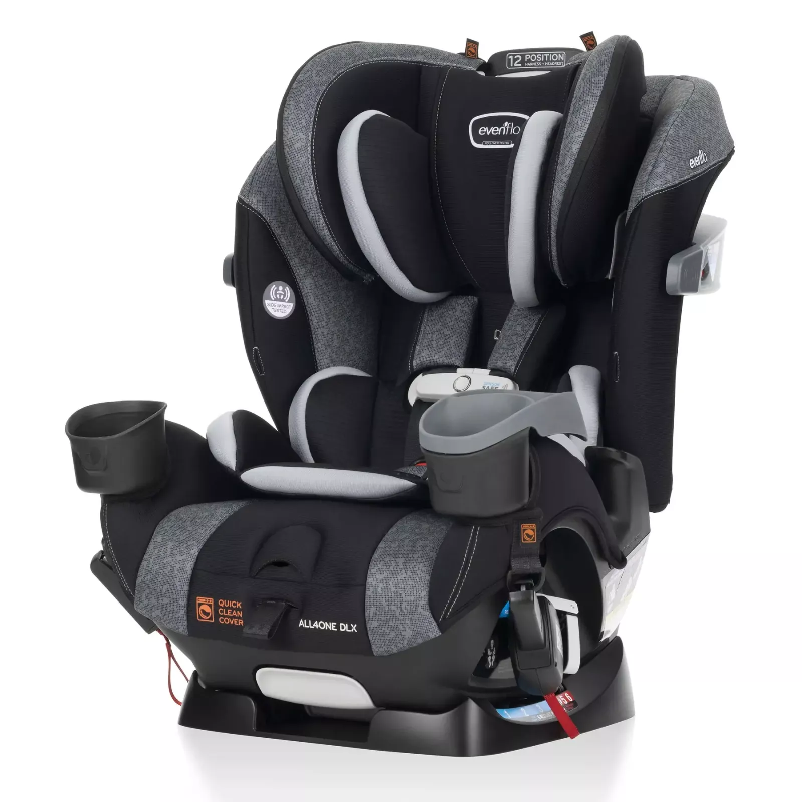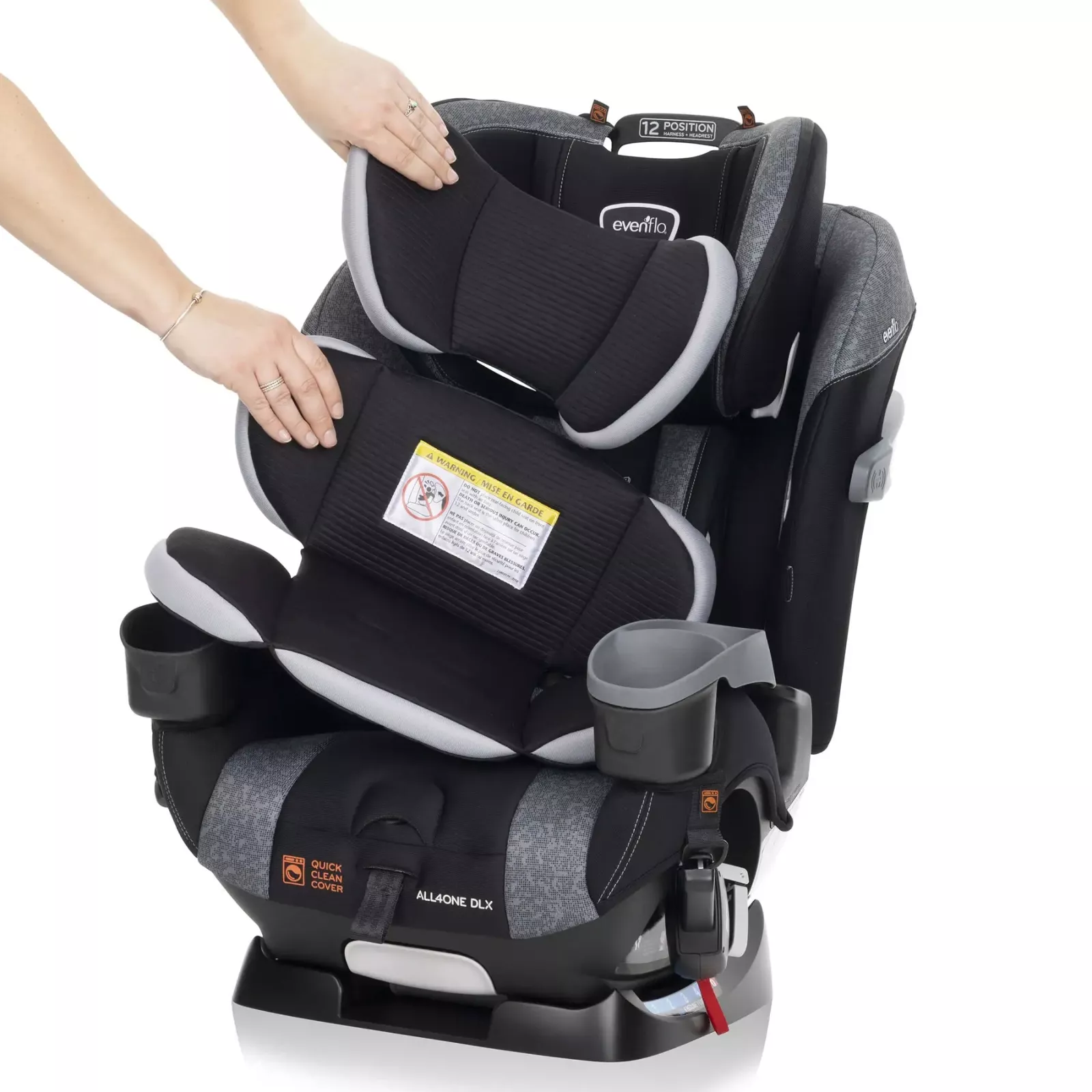 Evenflo All4one DLX – это универсальное автокресло, которое растет вместе с вашим ребенком и предназначено для использования с рождения до 12 лет. За 12 лет использования автокресло может быть адаптировано к каждому этапу развития вашего ребенка и подходит для детей весом от 1.8 до 54.4 кг (с рождения до 145 см ростом). Автокресло оснащено и укомплектовано четырьмя режимами «4-в-1», которые позволяют регулировать его в зависимости от роста и веса вашего ребенка, начиная с положения против направления движения для самых маленьких и заканчивая бустером со спинкой и без спинки для детей весом 55 кг, т.е. 12 лет.