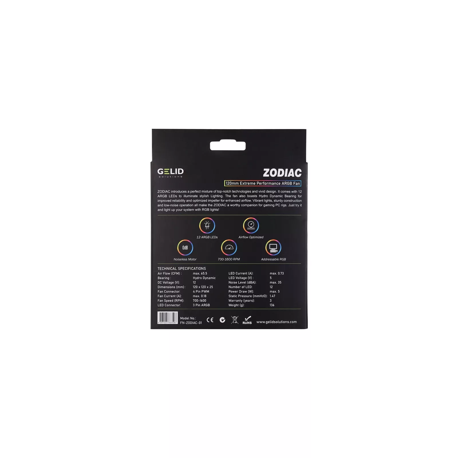 Вентилятор GELID Zodiac 120mm Extreme Performance ARGB представляет гармоничное сочетание первоклассных технологий и яркого дизайна. Он может похвастаться 12 светодиодами ARGB со стильной подсветкой. Он оснащен и укомплектован гидродинамическим подшипником для повышения надежности и оптимизированной крыльчаткой для улучшения воздушного потока..