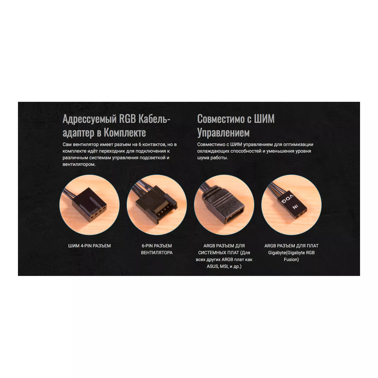 120-мм вентилятор с 6-пиновым коннектором и стильной светодиодной подсветкой Omni RGB. Отделка "под карбон" приятна на ощупь и придает столу футуристический вид. Доступ до 16,8 млн цветов осуществляется с совместимых системных плат с адресованной RGB подсветкой, включая ASUS Aura Sync, MSI Mystic Light Sync и Gigabyte RGB Fusion. Для работы подсветки требуется материнская плата или хаб (H66F/H106C) с поддержкой ARGB. Он оснащен и укомплектован 6-контактным переходным кабелем для подключения вентилятора к совместимым системным платам с адресованной RGB подсветкой.