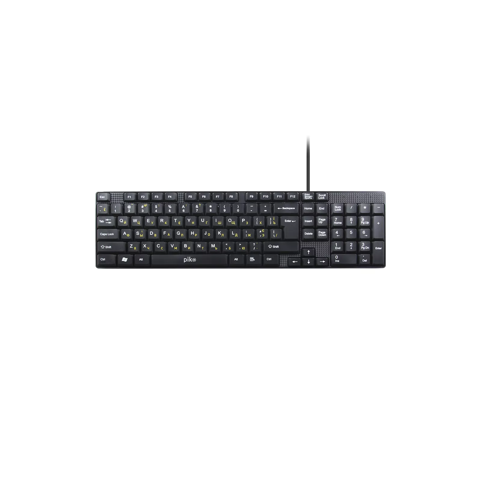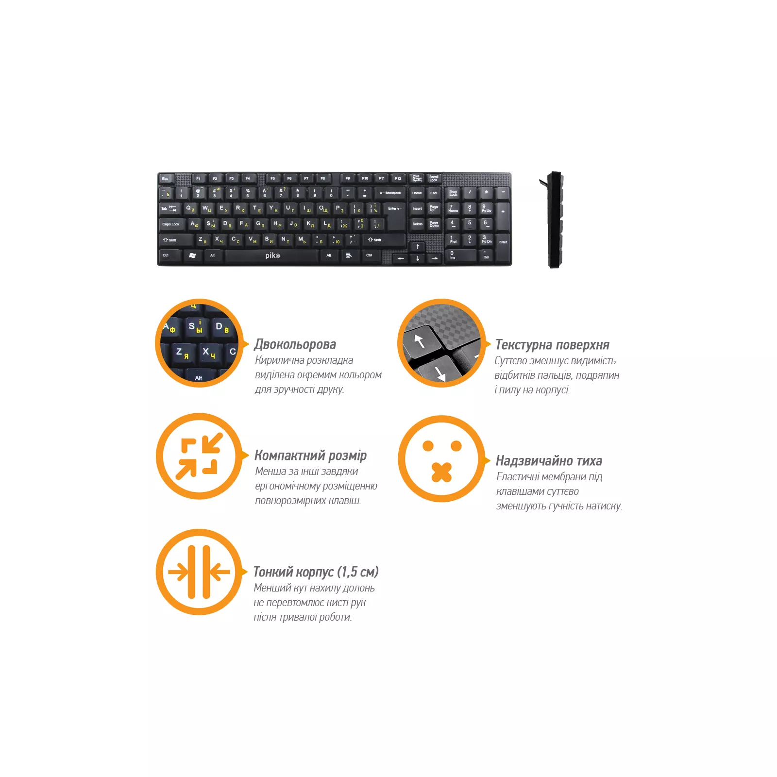Проводная клавиатура с эргономичным размещением полноразмерных и дополнительных мультимедийных клавиш. Благодаря этому она содержит набор всех необходимых кнопок и забирает меньше места, против других традиционных моделей. Кириллица содержит и украинский, и русский язык
