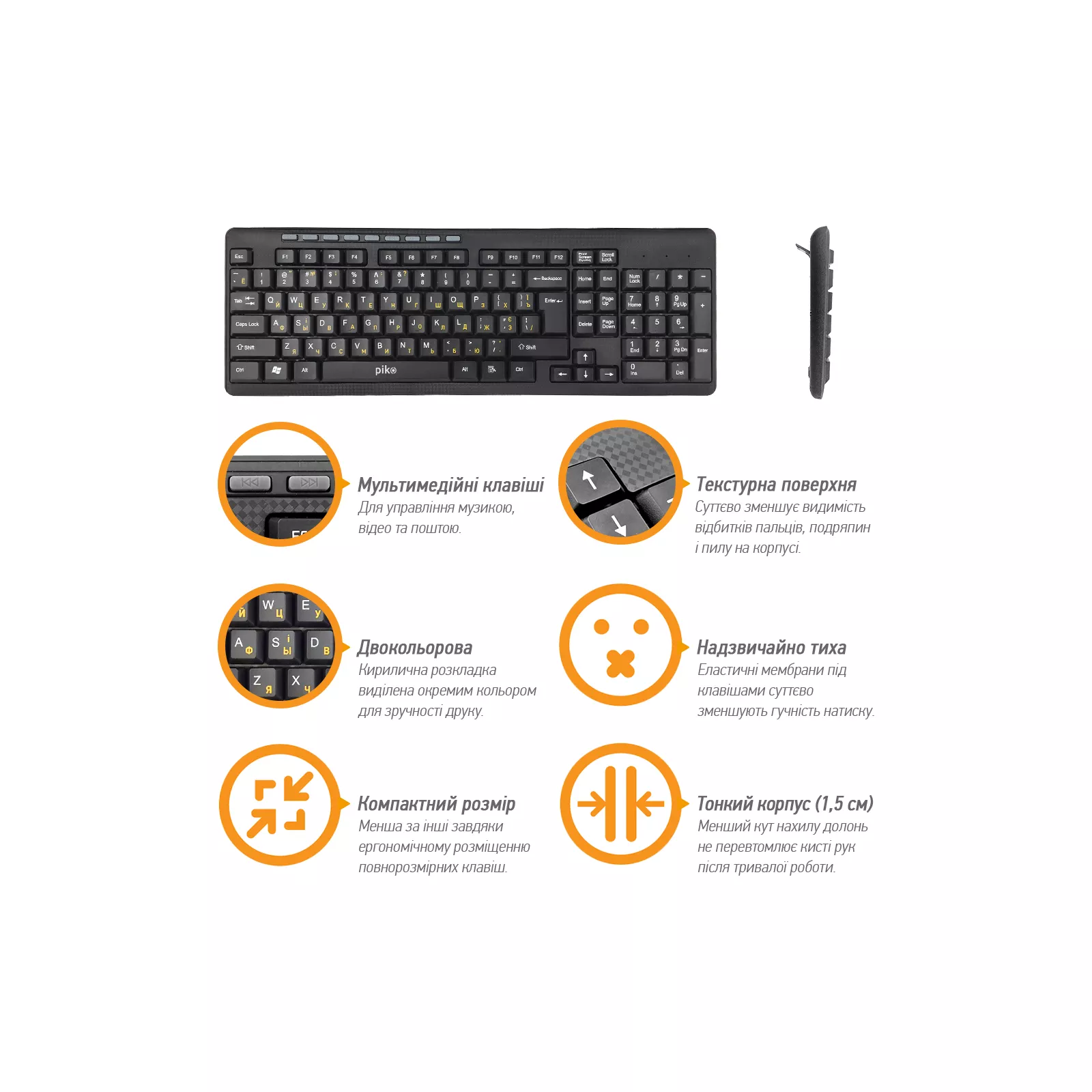 Проводная клавиатура с эргономичным размещением полноразмерных и дополнительных мультимедийных клавиш. Благодаря этому она содержит набор всех необходимых кнопок и забирает меньше места, против других традиционных моделей. Кириллица содержит и украинский, и русский язык