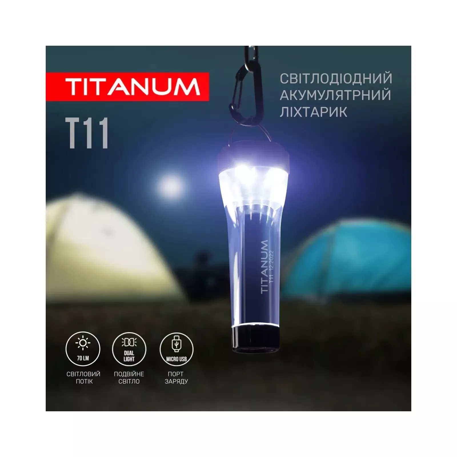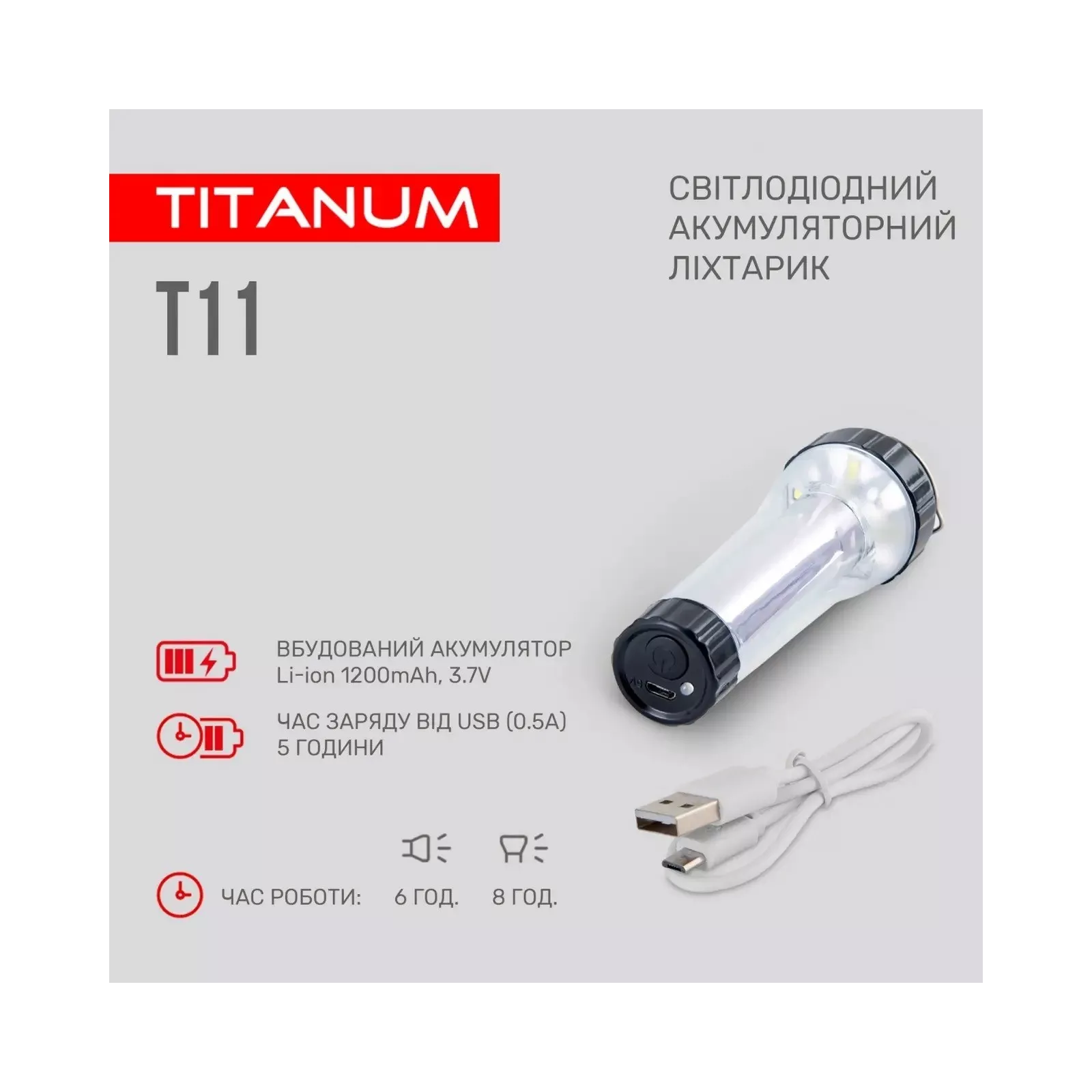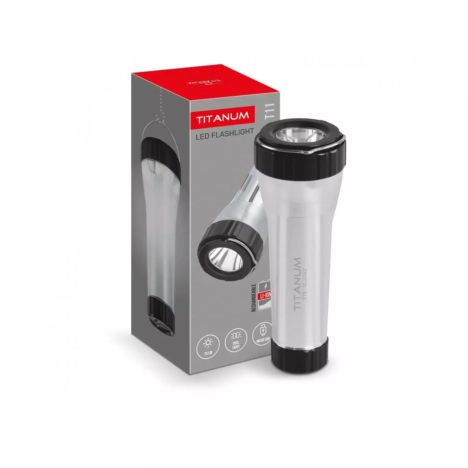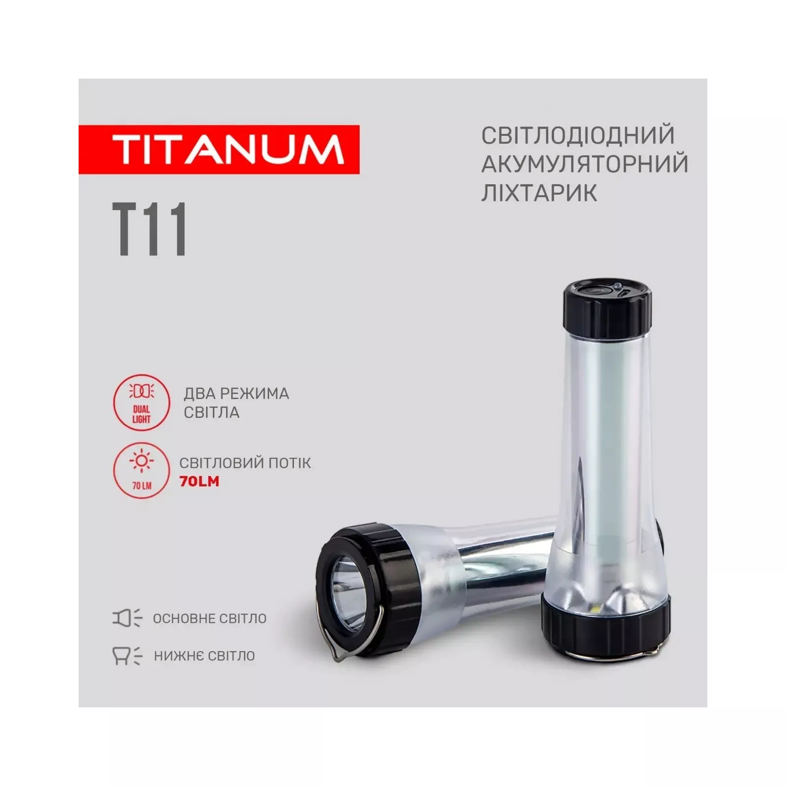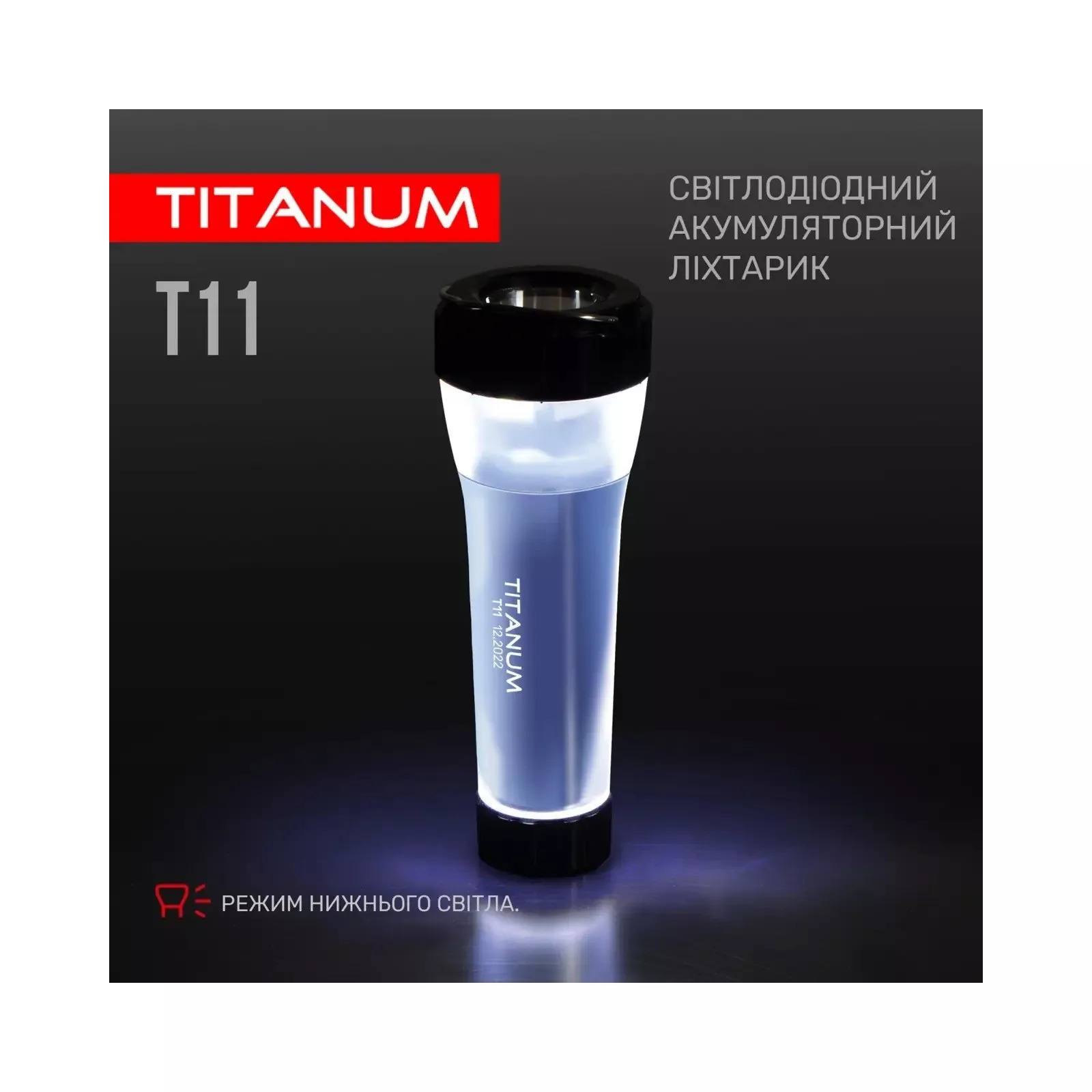 Портативный светодиодный фонарик TITANUM TLF-T11 передний (основной) и нижний, который используют преимущественно для ближнего освещения. Подходит для применения в быту, имеет полу кольцо на корпусе, благодаря которому очень удобно использовать в подвесном состоянии.