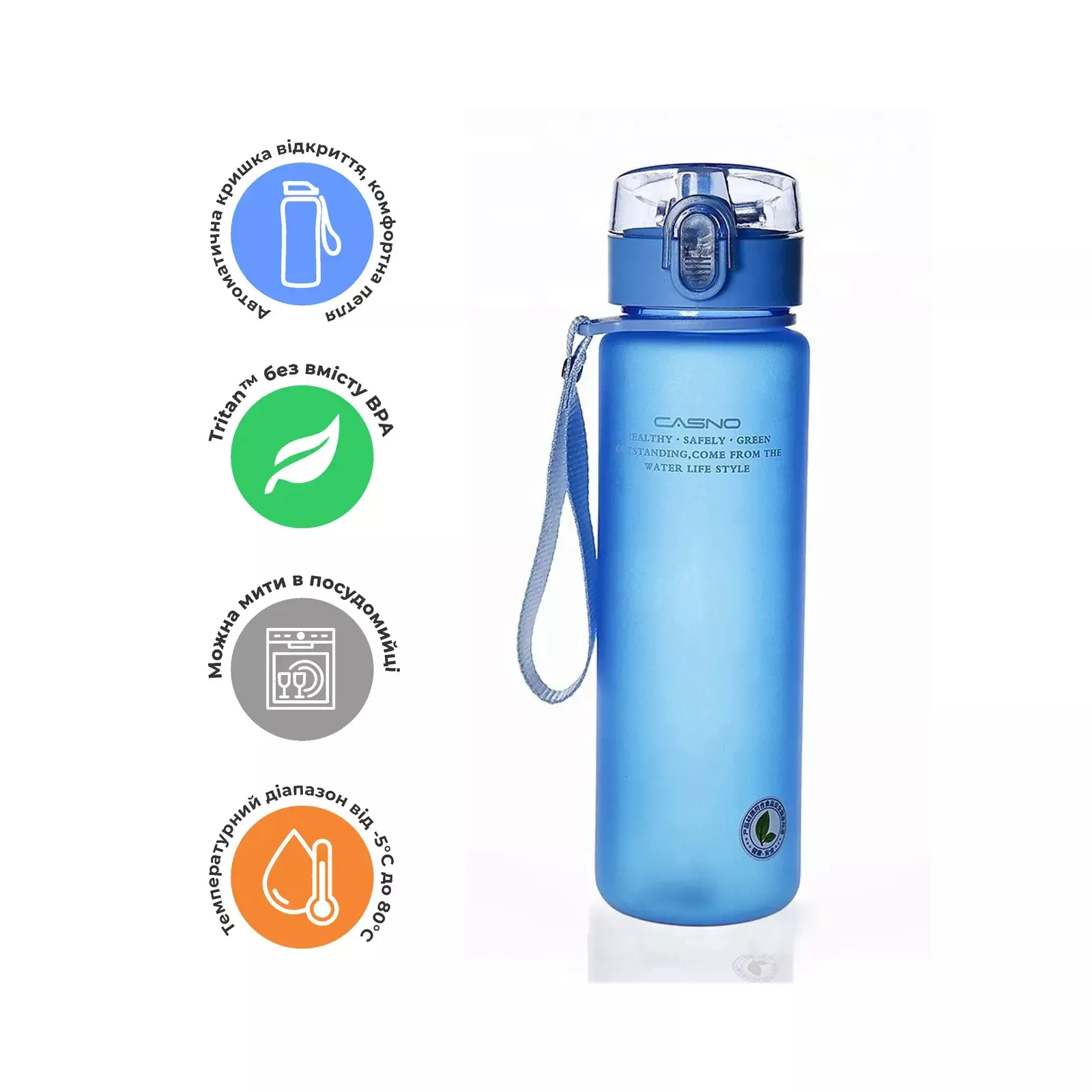 Casno — бутылка для воды, изготовленная из качественного Р7 полиэфирного пластика, она не имеет посторонний запах, удобен в использовании, не вреден для здоровья. Она идеально подходит для пеших прогулок, езды на велосипеде, кемпинга, трекинга, бега, йоги и любых других видов спорта дома, в тренажерном зале и в офисе.