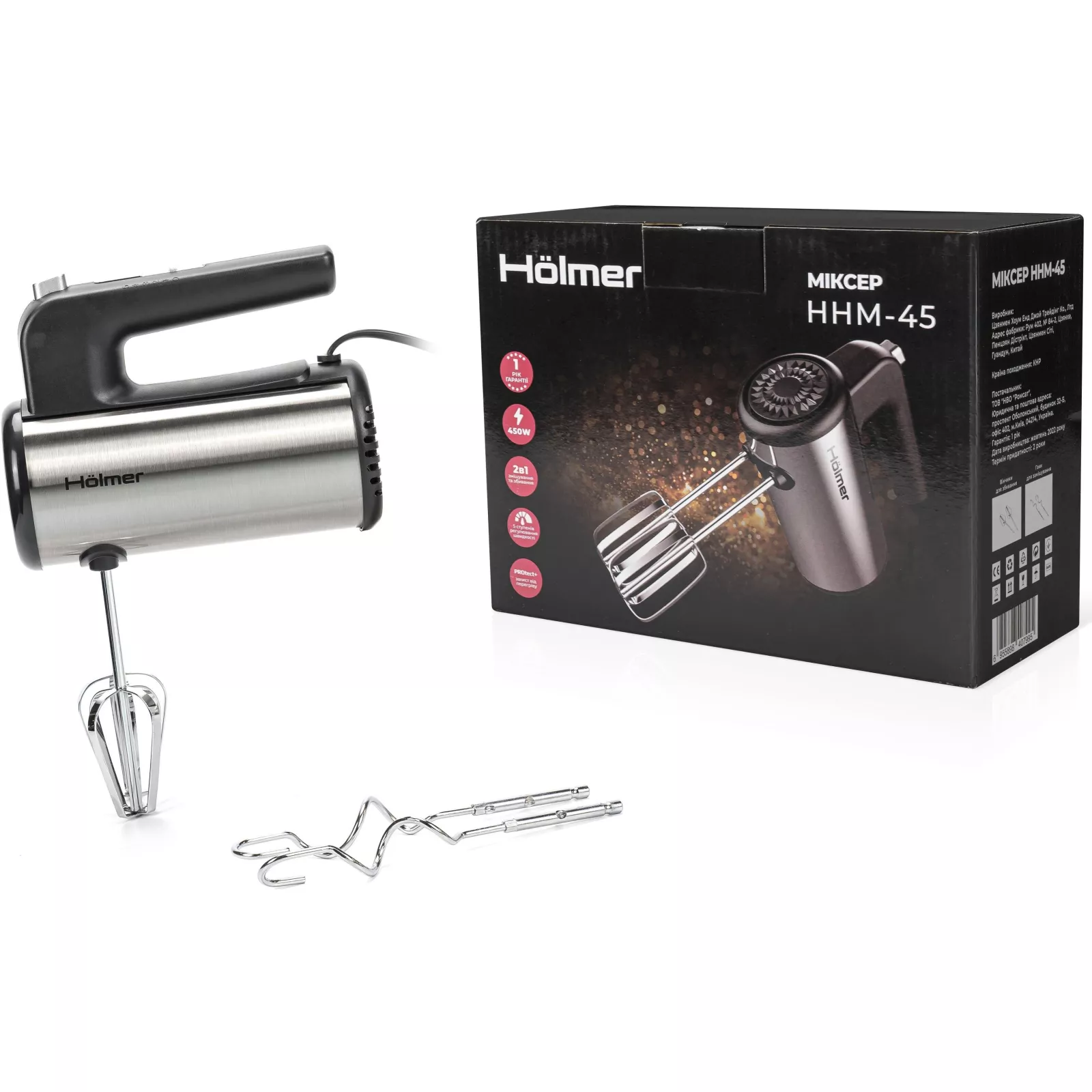 Универсальная модель ручного миксера «2 в 1» H?lmer HHM-45 – ежедневный ассистент на кухне. За короткий промежуток времени выполняет множество кулинарных задач, делая процесс приготовления пищи быстрым и приятным. Миксер имеет мощность 450 Вт, укомплектован венчиками для взбивания (2 шт.) и крюками для теста (2 шт). Имеет 5 ступеней регулировки скорости и ускоренный турбо режим. Для безопасной работы устройства предусмотрена функция защиты от перегрева.