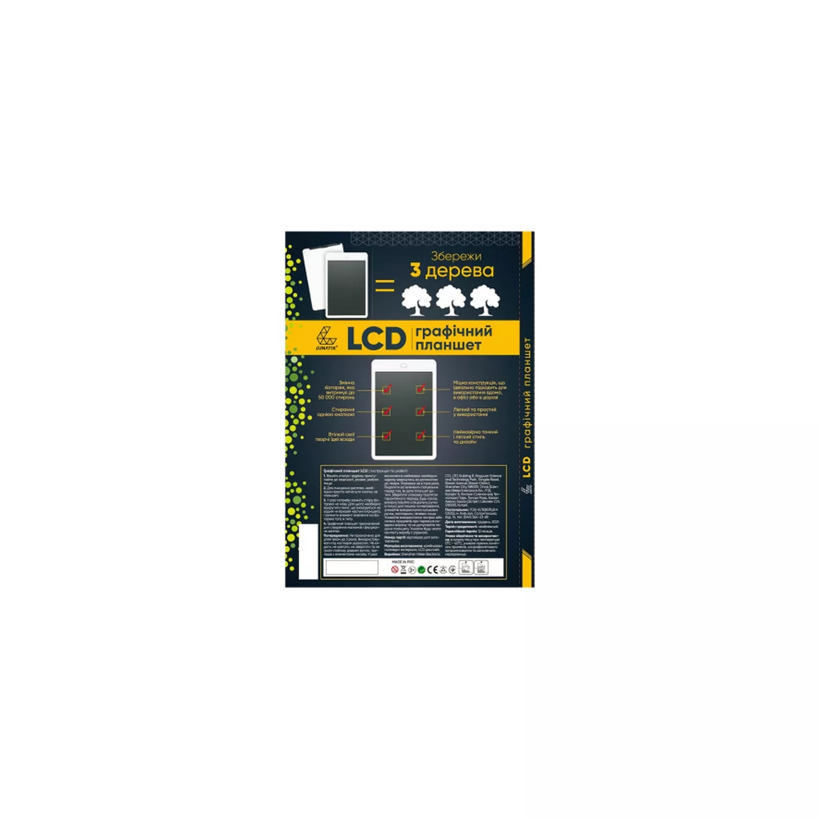 Легкий, компактный планшет, а главное с небьющимся долговечным LCD-экраном, удобно брать с собой в поездки.Габариты планшета позволяют легко вместить его в портфеле или рюкзаке.Специальная ручка(стилус) в комплекте позволит создать любые рисунки. Планшет разработан специально для детей, поэтому он безопасен в использовании.В планшете стоит очень экономичная батарея.Энергия тратится только на стирание и рисование изображений.Не рекомендуется использовать для рисования острые предметы.В планшете предусмотрена функция сохранения предыдущего изображения.