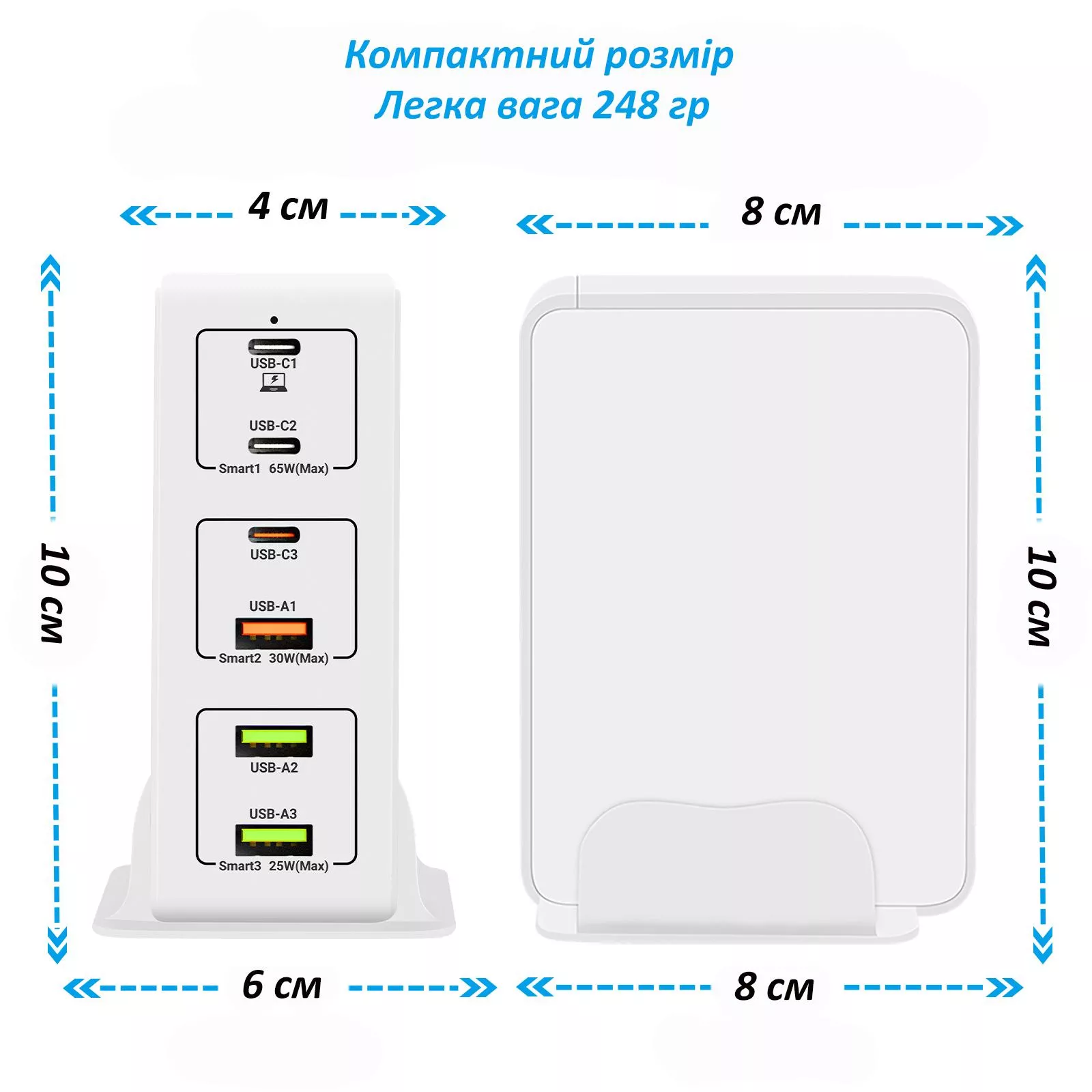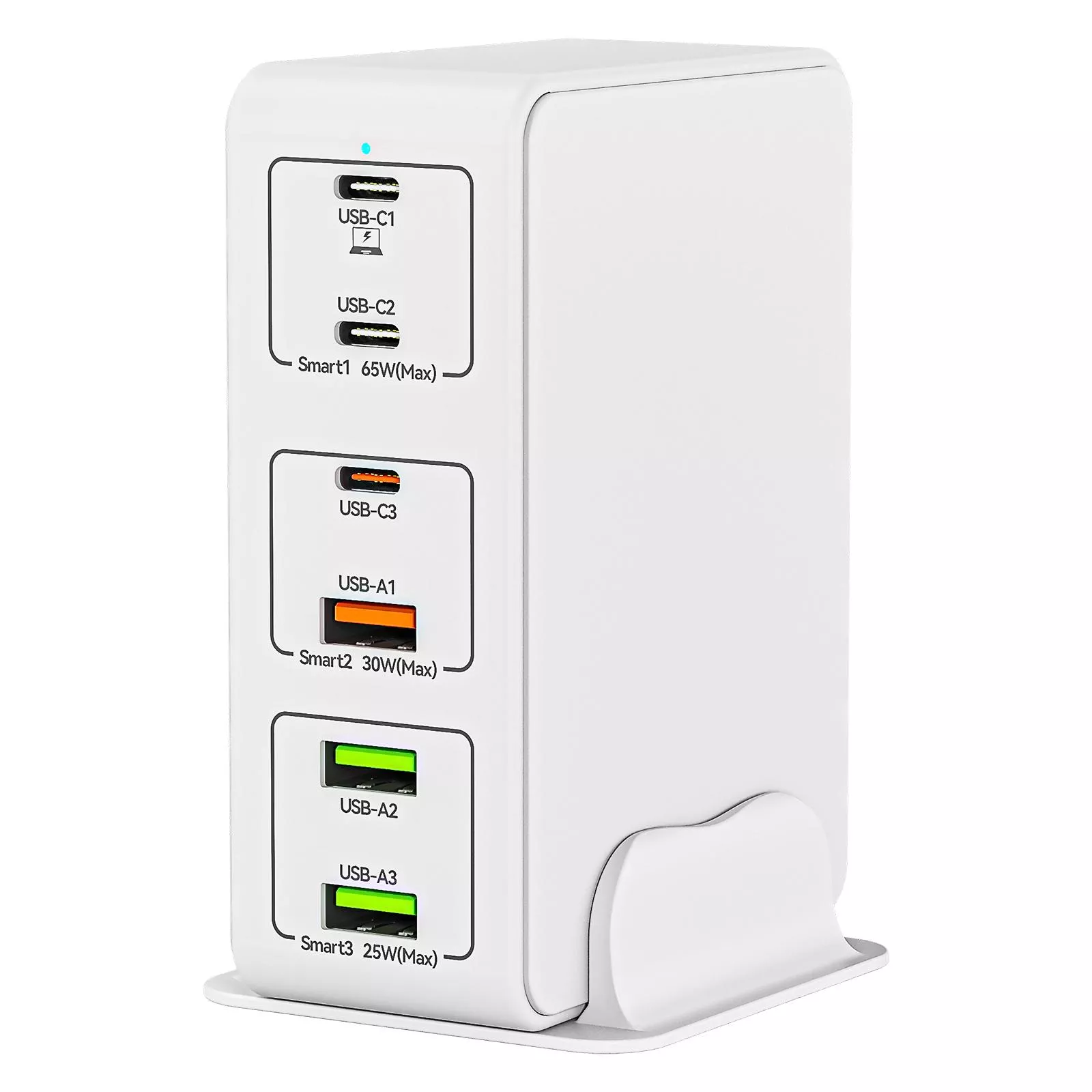 Порт подключения USB-C с максимально и в полном объеме мощностью 65 Вт сверху, USB-C и USB-A с максимально и в полном объеме мощностью 30 Вт в среднем ряду и порты USB-A с максимально и в полном объеме мощностью 25 Вт в нижнем ряду.