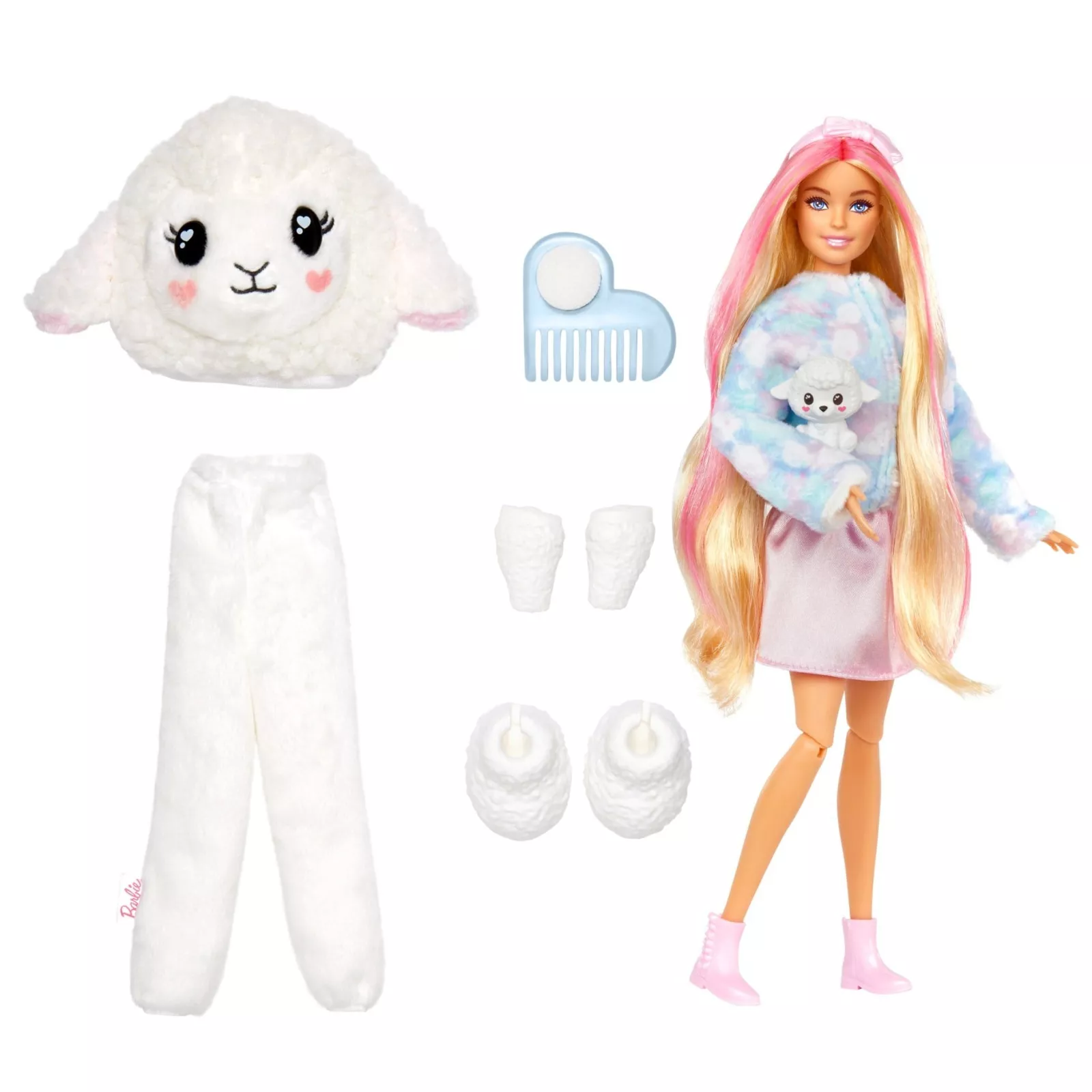 Кукла Barbie Cutie Reveal Мягкие и пушистые Ягненок с 10 сюрпризами дарят самые милые впечатления от распаковки плюшевых зверушек, модного наряда и веселых перевоплощений! В коробке вы найдете милый плюшевый ягненок в цветной футболке с надписью «Dream», в которой прячется кукла! Снимите голову костюма – и вы увидите куклу Barbie с длинными светлыми волосами, 11 подвижными шарнирами и нежным макияжем на лице! Откройте 4 пакетика с сюрпризами: атласную юбку; повязку на голову Barbie; обувь; расческа; очаровательный маленький ягненок. Если вывернуть верхнюю часть костюма, она превратится во флисовую курточку с принтом в облаках цвета конфет. А из головы костюма можно сделать кроватку для зверька! Нанесите ледяную воду, чтобы у куклы появилась цветная прядь, а любимец «открыл» глаза. Чтобы вернуть все вспять, нанесите теплую воду. Это отличный подарок для детей от 3-х лет, особенно тех, которые обожают милые сюрпризы!