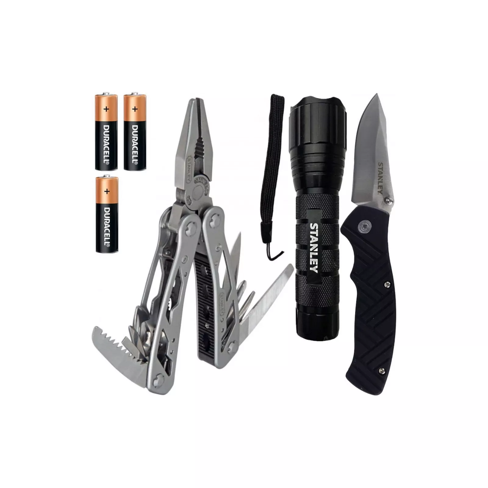 Компактный и практичный набор, в котором собраны инструменты для любителей активного отдыха и работы. Мультитул 12 в одном в комплекте: универсальные плоскогубцы с зубчатыми и закругленными губками и губками для резки проволоки, пильный диск, маленький нож, большой нож, открывалка для бутылок, плоская отвертка 3, 4, 8 мм, PH1, напильник, из нержавеющей стали, фонарик имеет светодиод со световым потоком 150 лм, что обеспечивает низкое энергопотребление и сильный яркий свет. Алюминий, водонепроницаемый корпус, устойчив к повреждениям объектив, удобный большой выключатель, питание от 3 батареек Duracell AAA (у комплекте), длина фонаря: 135 мм, диаметр фонаря: 35 мм. Складной карманный нож с фиксатором лезвия.