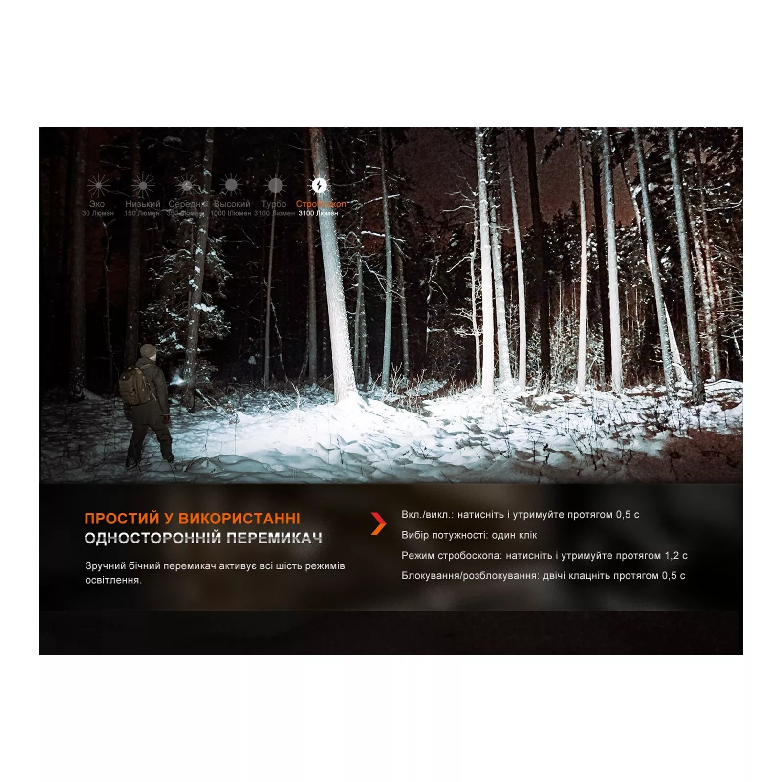 Диод Luminus SST70, используемый в фонаре, холодного белого цвета имеет ресурс работы около 5.5 лет. Благодаря сочетанию тонкой линзы из стекла и рассеивателя AOD-S V2.0 от Fenix, освещение мягкое и равномерное, без мелких артефактов. Чтобы предотвратить риск перегрева и поломки внутренней электроники, фонарь оснащен и укомплектован защитной платой IOP. В случае нагревания оболочки до отметки 60&C срабатывает защита, снижается яркость света и конструкция постепенно остывает. стробоскоп.
