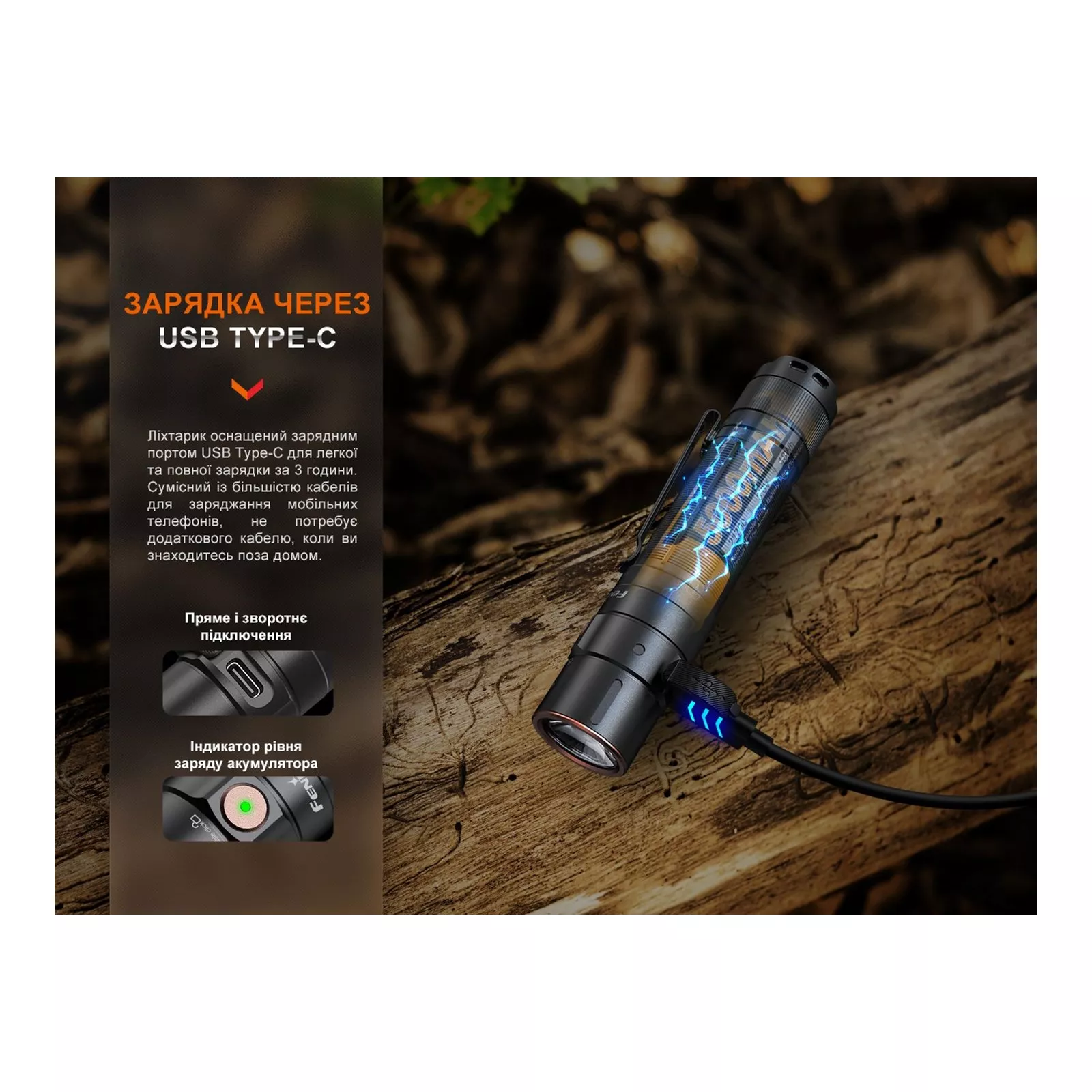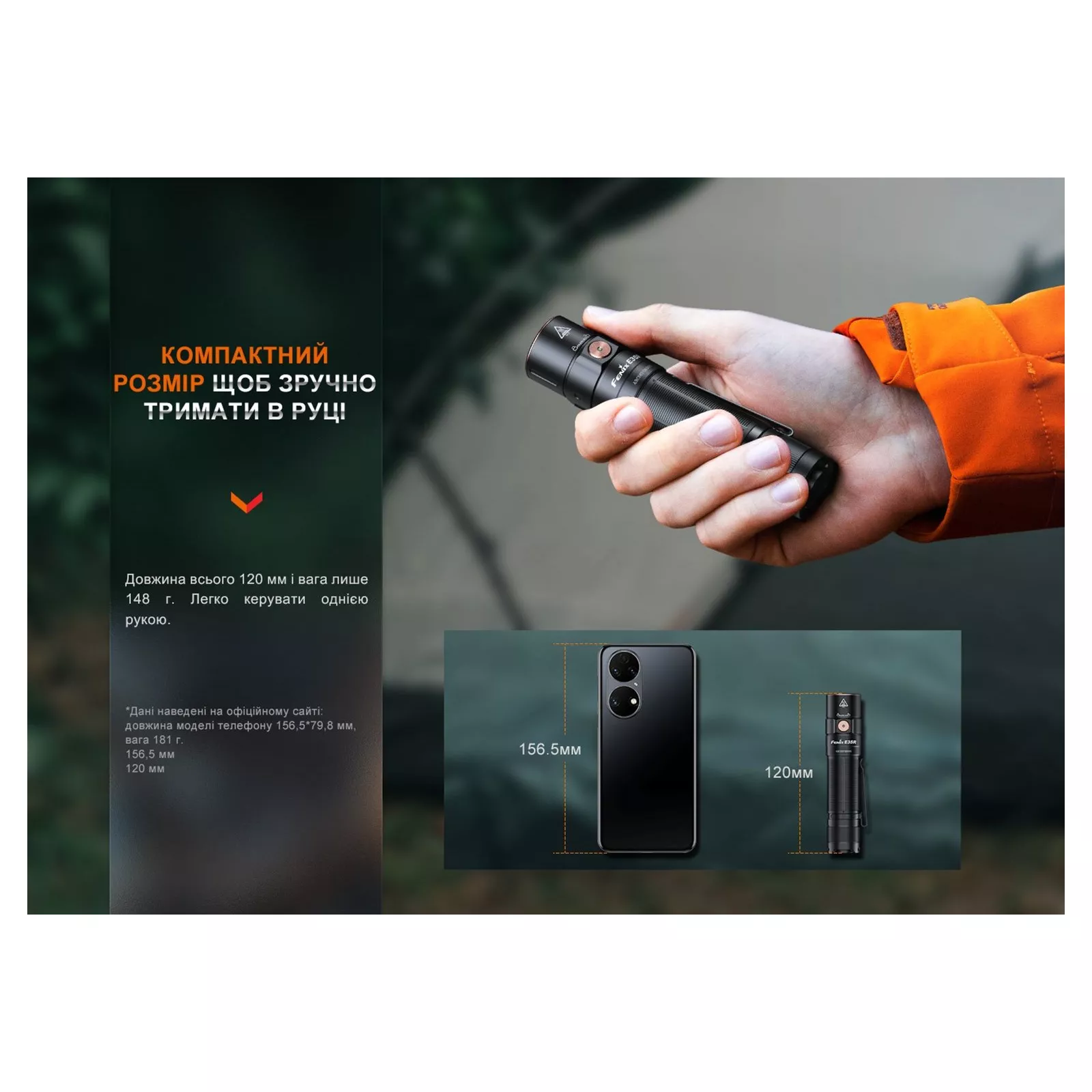 Источник питания: Fenix E35R может непрерывно светить почти трое суток, поскольку фонарь питается от высокопроизводительного элемента питания перезаряжаемого типа — Li-ion аккумулятора 21700. Лучшим вариантом для данной модели является фирменный аккумулятор ARB-L21, он имеет гарантированно высокое качество. Когда цветной индикатор в кнопке управления сигнализирует о низком уровне заряда аккумулятора, можно использовать порт Type-C и зарядить модель всего за 3 часа. в ношении. Длина корпуса равна 120 мм, диаметр головы – 26.5 мм, диаметр хвоста – 24.8 мм. Вес модели вместе с включенным в набор аккумулятором составляет 148 граммов.