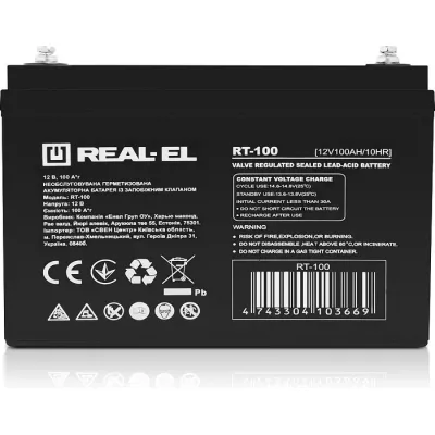 Используйте REAL-EL RT-100 для ИБП/UPS, телекоммуникационных систем, электросетей, медицинского оборудования, аварийного освещения и систем безопасности. Доверьтесь качеству и надежности с аккумуляторной батареей REAL-EL RT-100. Особенности: Свинцово-кислотная аккумуляторная батарея типа AGM>