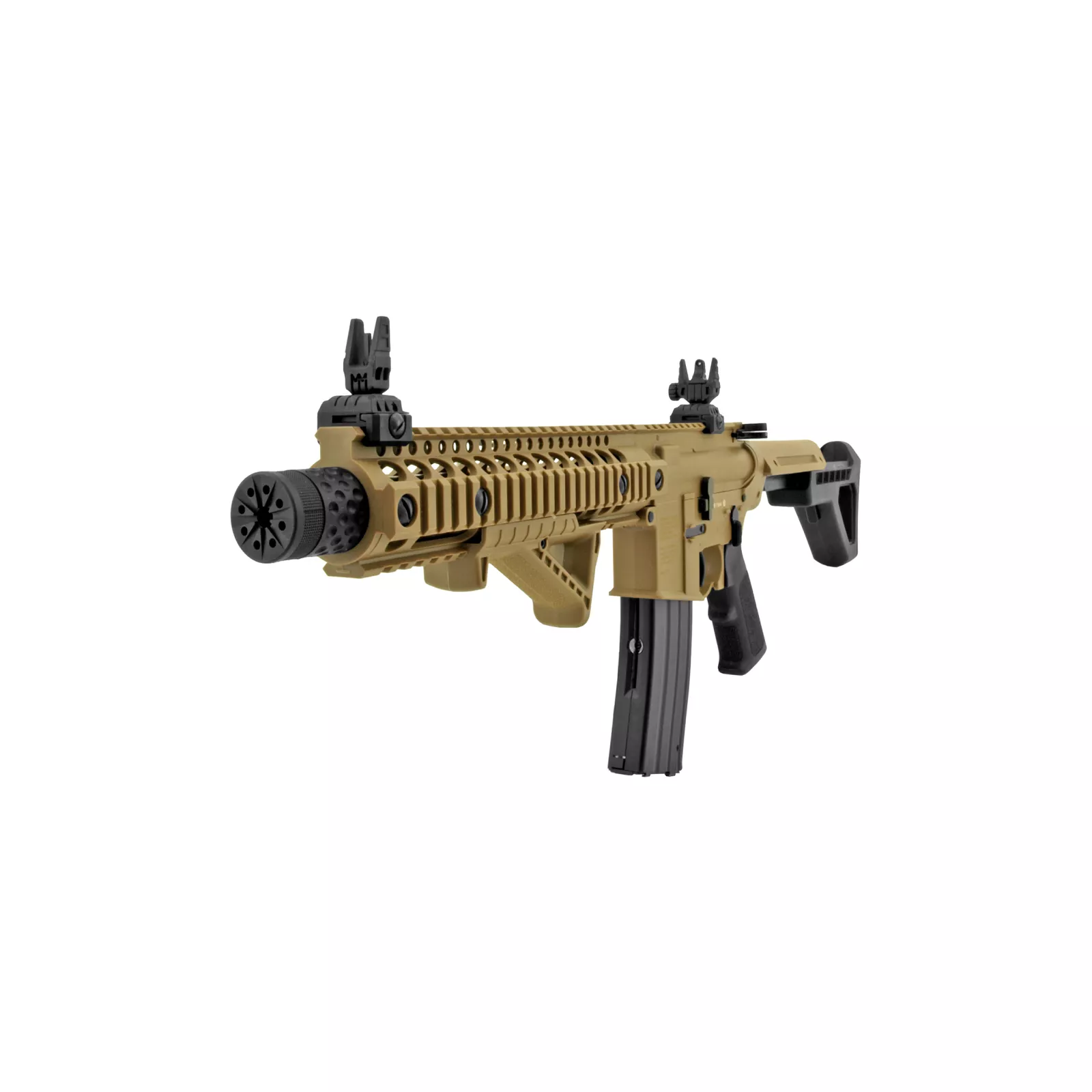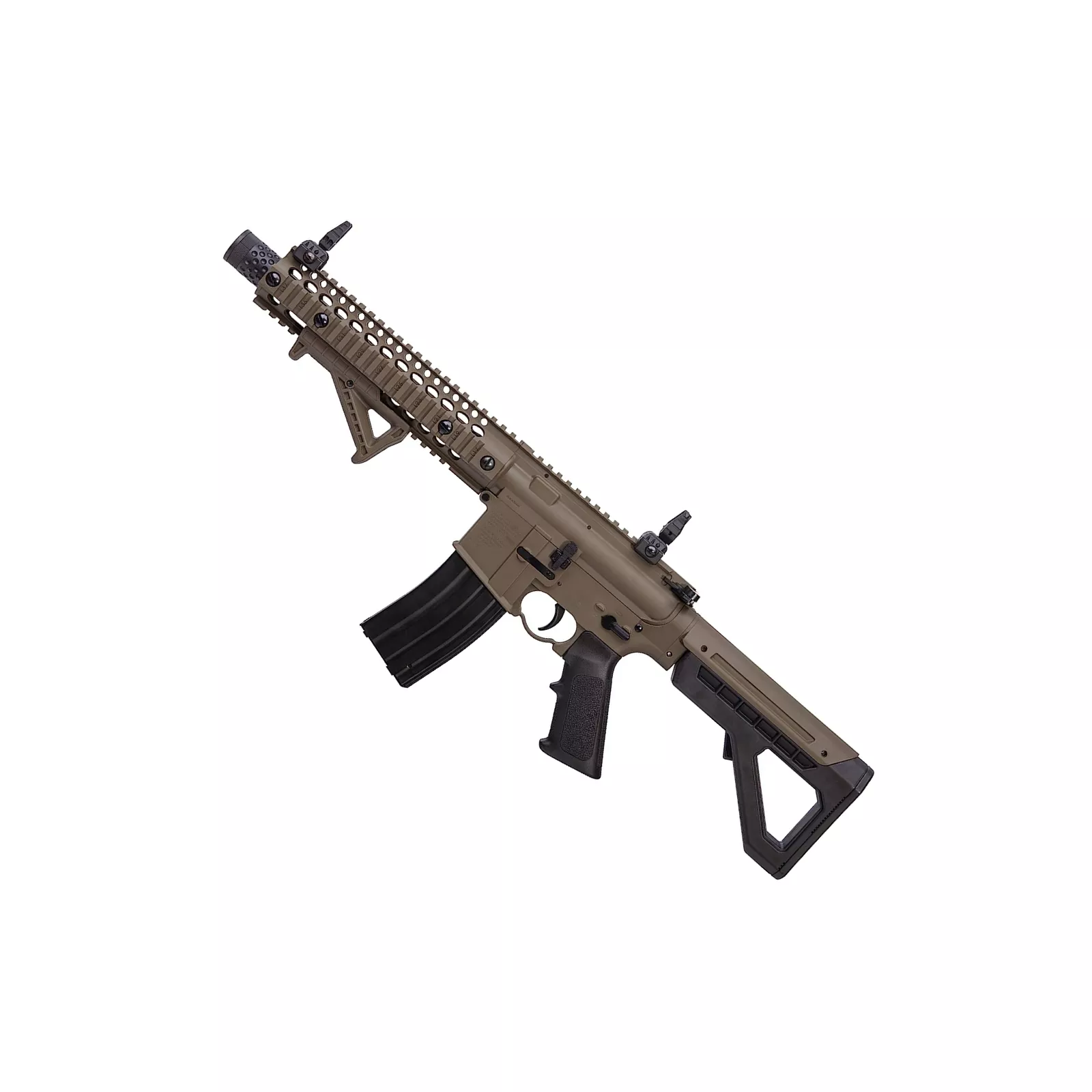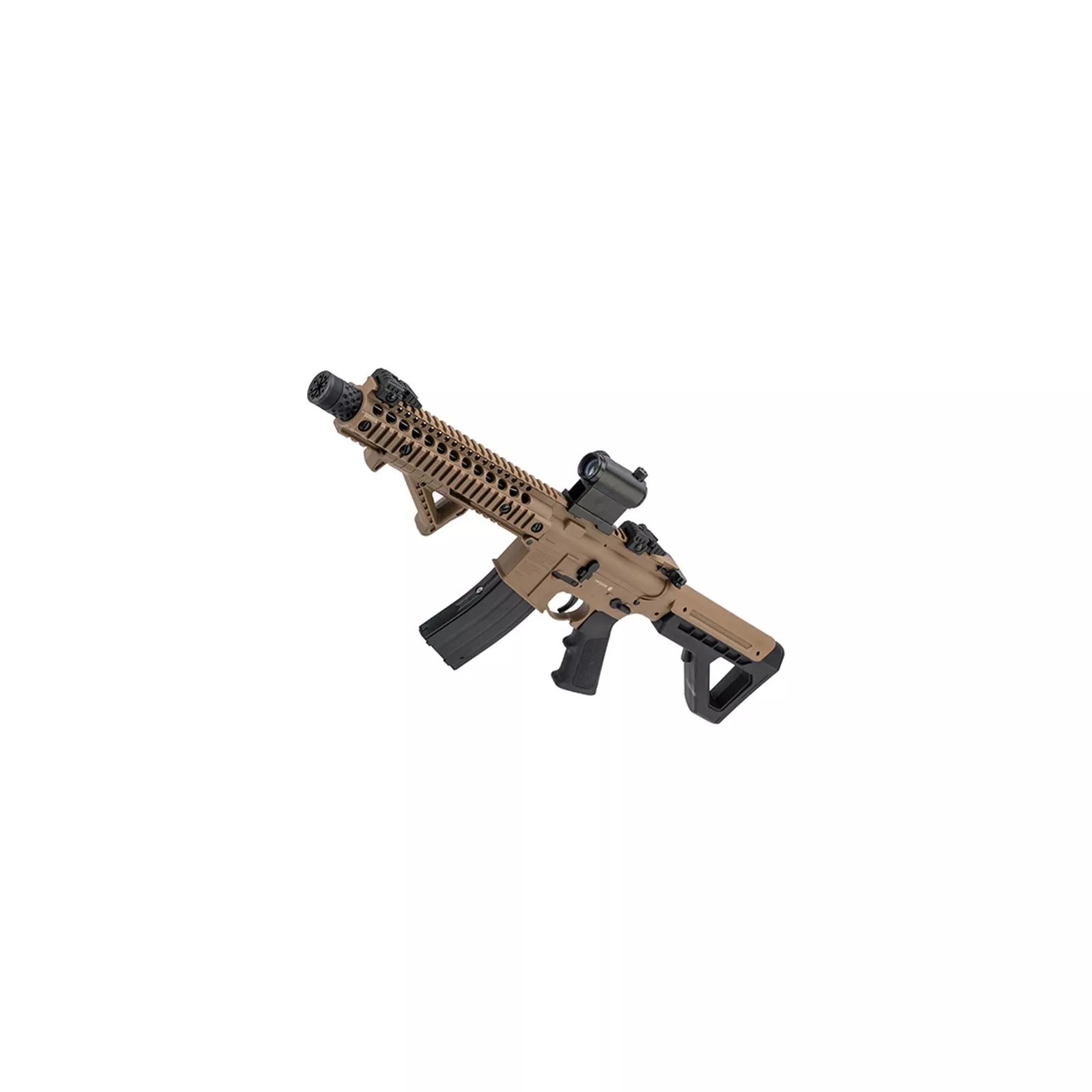 Эта пневматическая винтовка выстреливает шары со скоростью 131 м/с, а ее скорострельность достигает впечатляющих 1400 выстрелов в минуту! Стрельба ведется двумя 12-граммовыми патронами CO?, размещенными в 25-зарядном магазине, а двойной переключатель позволяет выбрать между полуавтоматическим и автоматическим режимами. Пневматическая винтовка оснащена и укомплектована 6-точечным регулируемым задним прикладом, подвижным угловым струйкой и направляющим типа Quad rail для установки фонарей, лазеров и других аксессуаров. Поставляется с предохранителем, который переключается большим пальцем для обеспечения правильного и безопасного обращения с винтовкой, съемными прицельными устройствами.-тактическая, полно-или полуавтоматическая пневматическая винтовка BB;-заправляется двумя 12-граммовыми картриджами CO2 и развивает скорость до 131 м/с;
