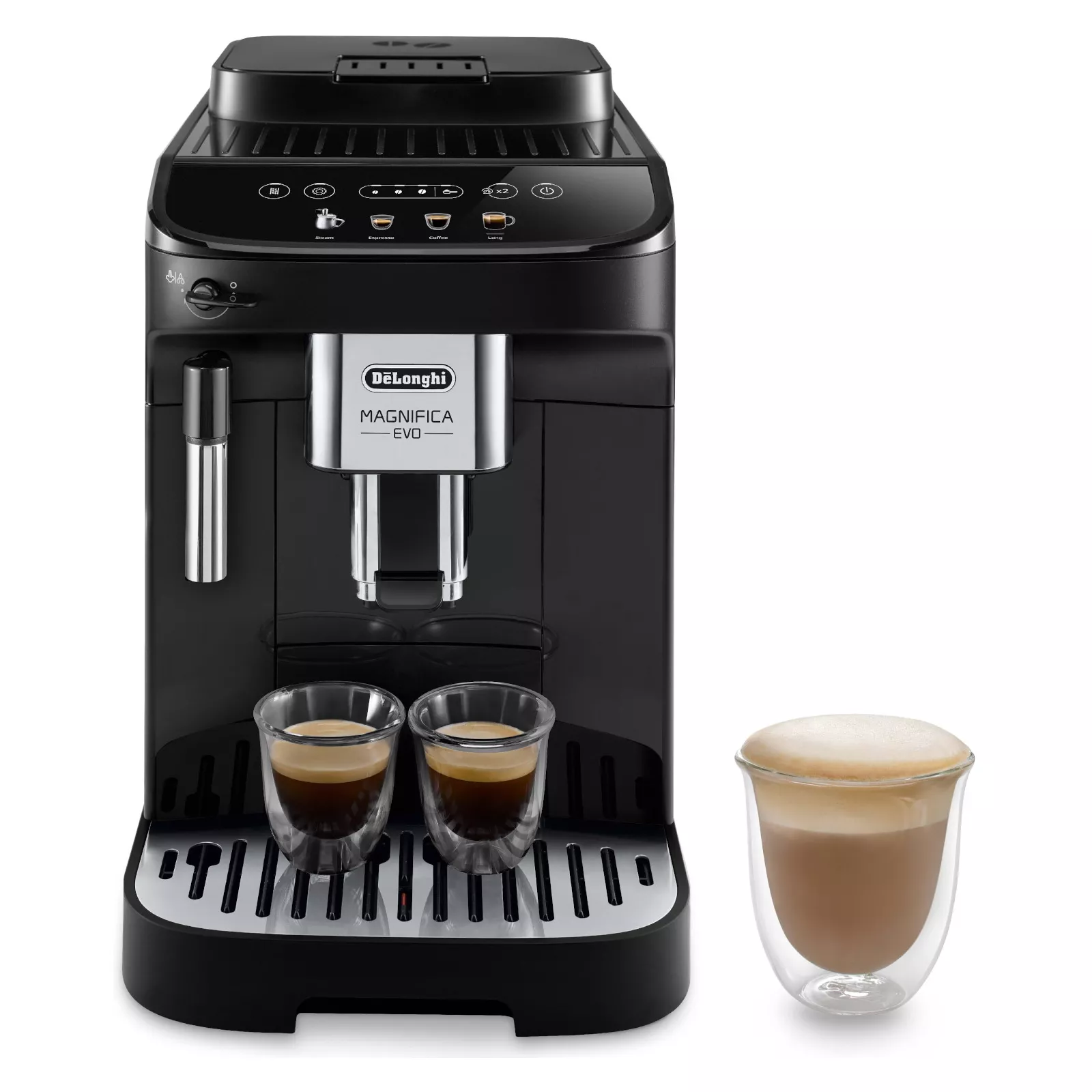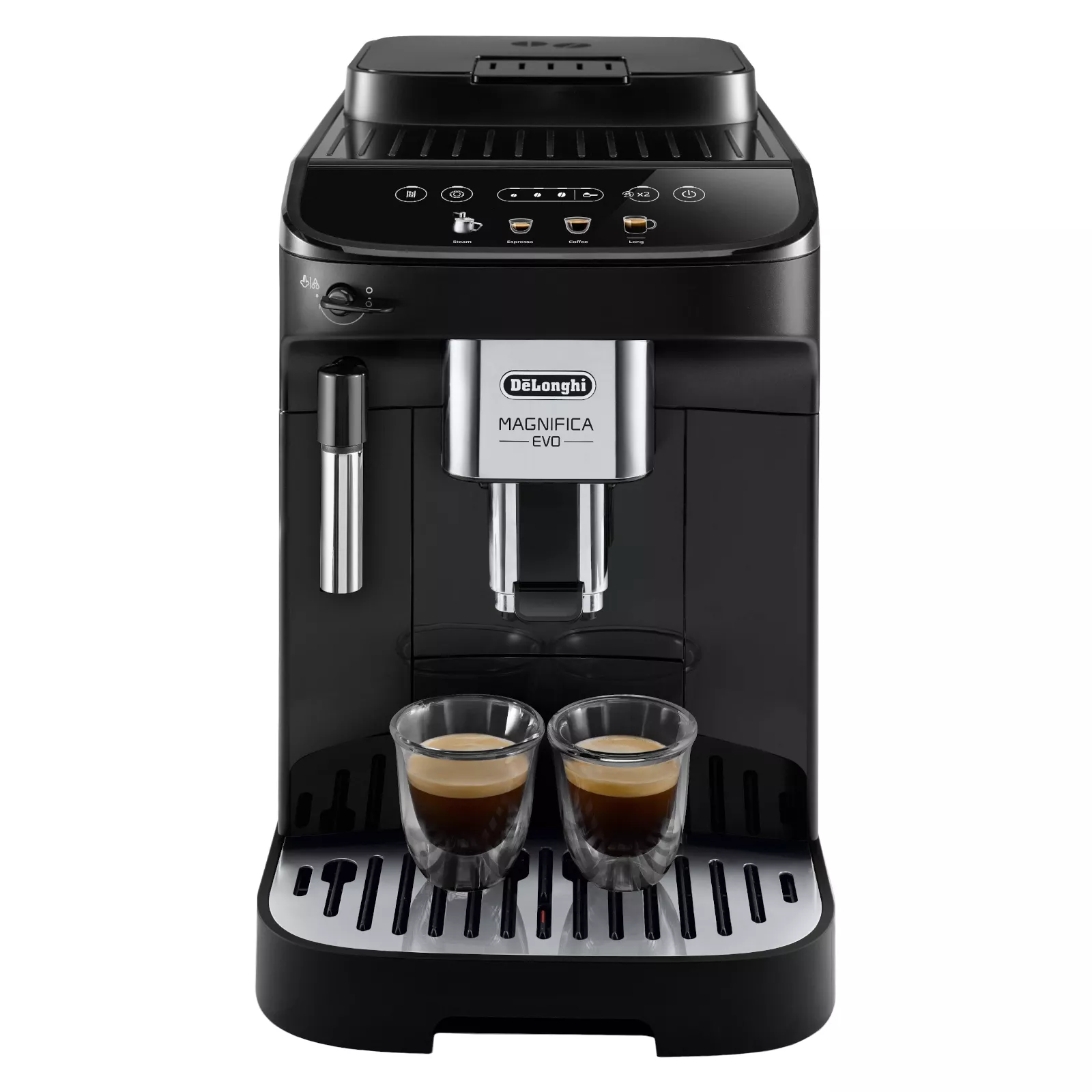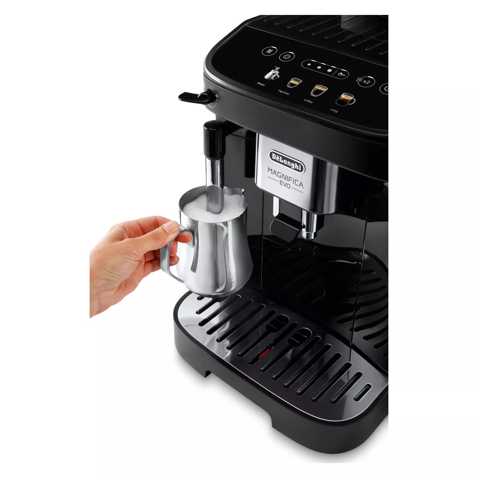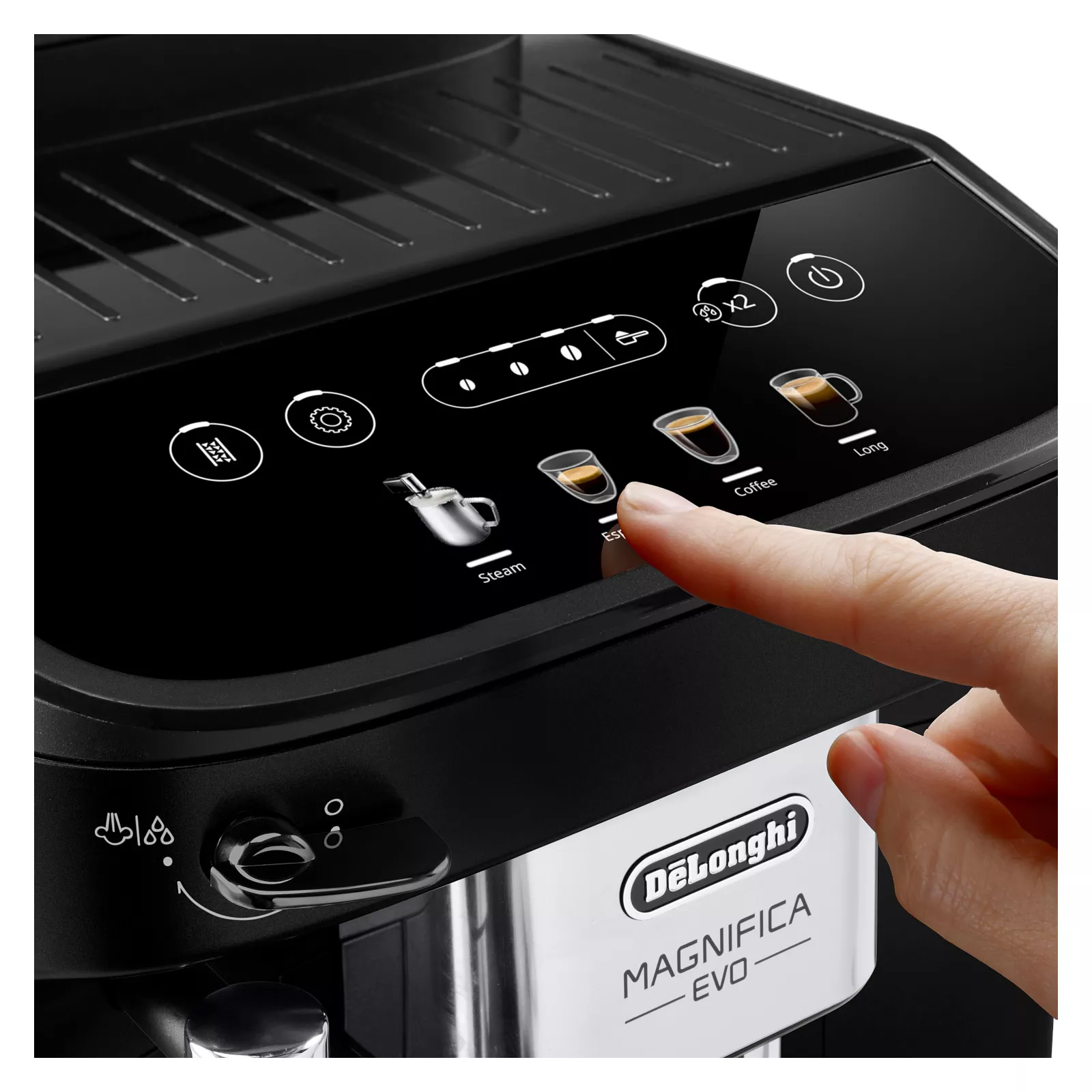 ВАШ ПЕРСОНАЛЬНЫЙ БАРИСТАНаслаждаться эспрессо и коктейлями на его основе можно не только в кафе, но и просто приготовив их самостоятельно. Конечно, если вы купили кофеварку DeLonghi ECAM 290.21 B Magnifica Evo! Оптимальный выбор для повседневного обихода. Комплекс с набором минимально необходимого функционала для каждого кофемана. Стандартный для устройств такого класса насос создает давление до 15 бар, чтобы в считанные минуты готовить порцию эспрессо. Даже две сразу. И обязательно с мягкой коричневой пенкой «крема». Также не забудьте выбрать оптимальную меру помола зерен для встроенной кофемолки. От него во многом зависит вкус и крепость напитка. Потребление энергии в режиме заваривания не превышает 1450 Вт. Прибор находится в режиме ожидания большую часть времени и автоматически отключается после простоя. Классический дизайн стильного черного корпуса – не занимает слишком много места и гармонично смотрится в любом интерьере как домашней, так и офисной кухни. Эспрессо плюс