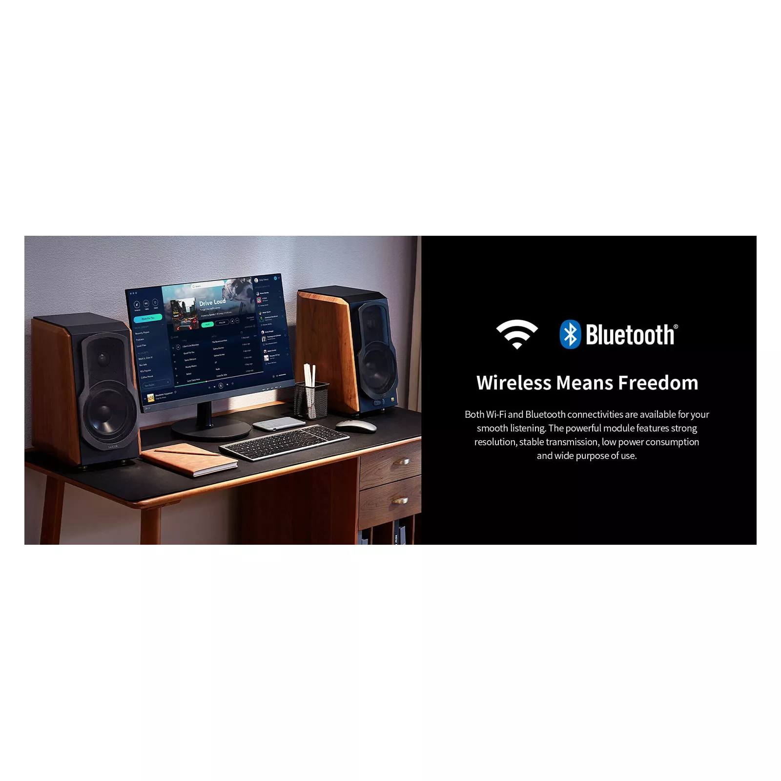 Связь Wi-Fi и Bluetooth доступно для бесперебойного прослушивания. Мощный модуль отличается высоким разрешением, стабильной передачей, низким энергопотреблением и широким спектром применения.