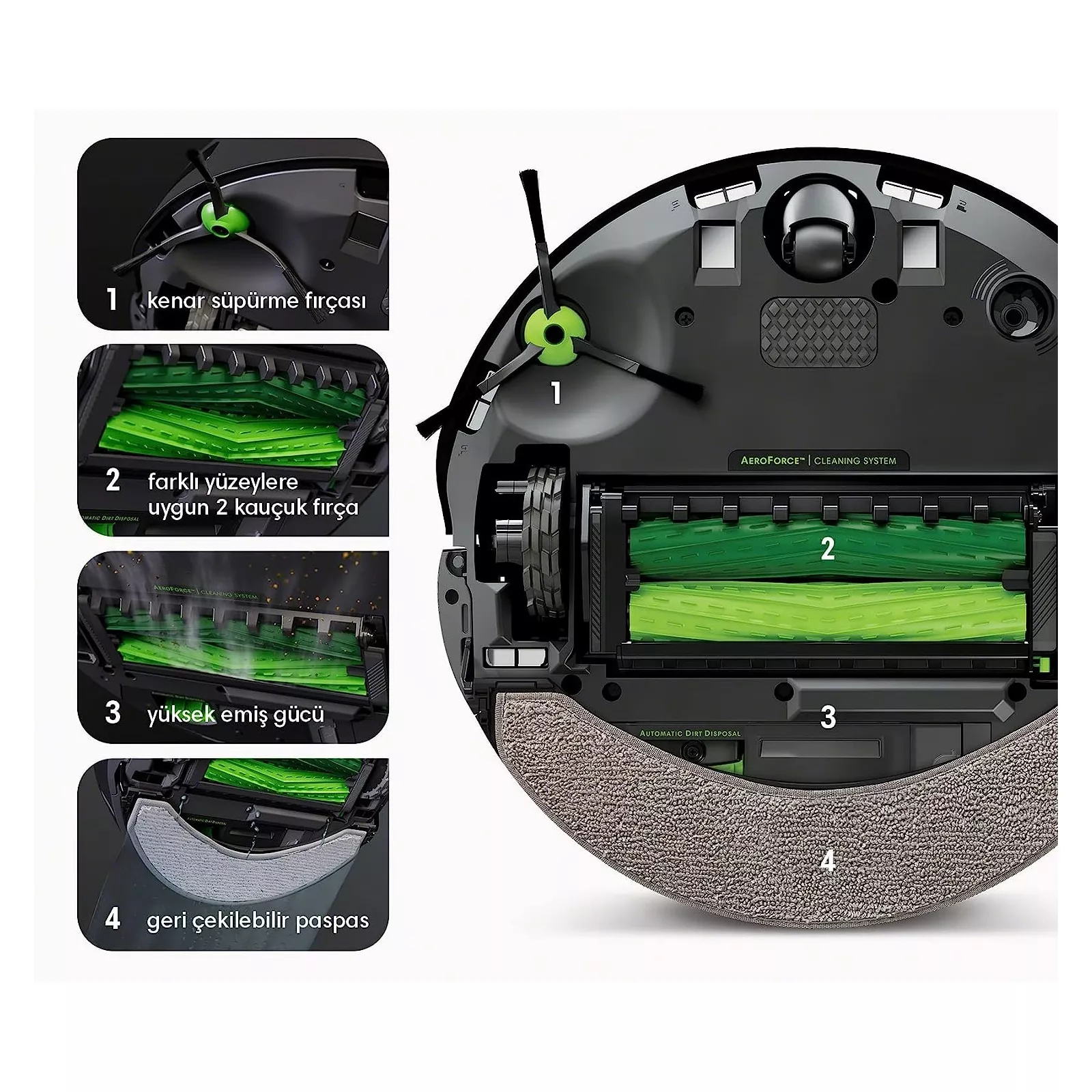 4-ступенчатая система очистки сочетает боковую щетку для очистки углов и краев с 2 основными резиновыми щетками для всех поверхностей, в 10 раз большую мощность всасывания и уникальный модуль для мытья. Благодаря наличию боковой щетки Roomba может эффективно очищать места вокруг мебели, вдоль стен, углы комнат и другие труднодоступные места. Запатентованная система двух вращающихся резиновых щеток собирают грязь со всех типов твердых полов и ковров. Затем грязь всасывается между щетками в корзину для уборки. В корзине есть усовершенствованный фильтр AeroForce, который очищает выбрасываемый воздух от пыли и аллергенов.