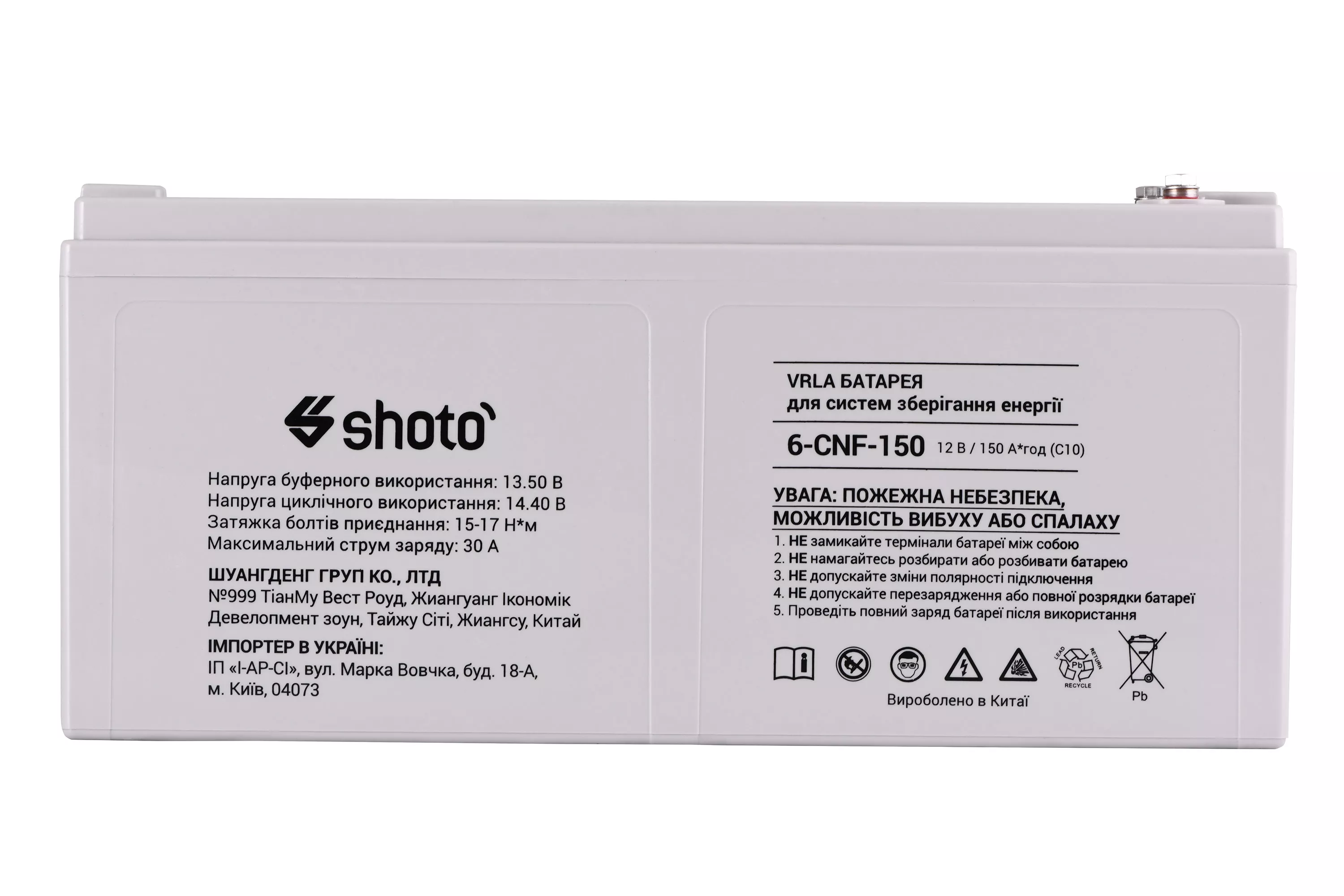 Приобрести Аккумуляторная батарея SHOTO 6CNF, 12V, 150Ah, GEL-CARBON Вы можете у компании "А-ТЕХНО", оформив заказ на этом сайте через корзину или позвонив по указанным телефонам. Описание SHOTO Аккумуляторная батарея 6CNF, 12V, 150Ah, GEL-CARBON Основные направления использования:>
