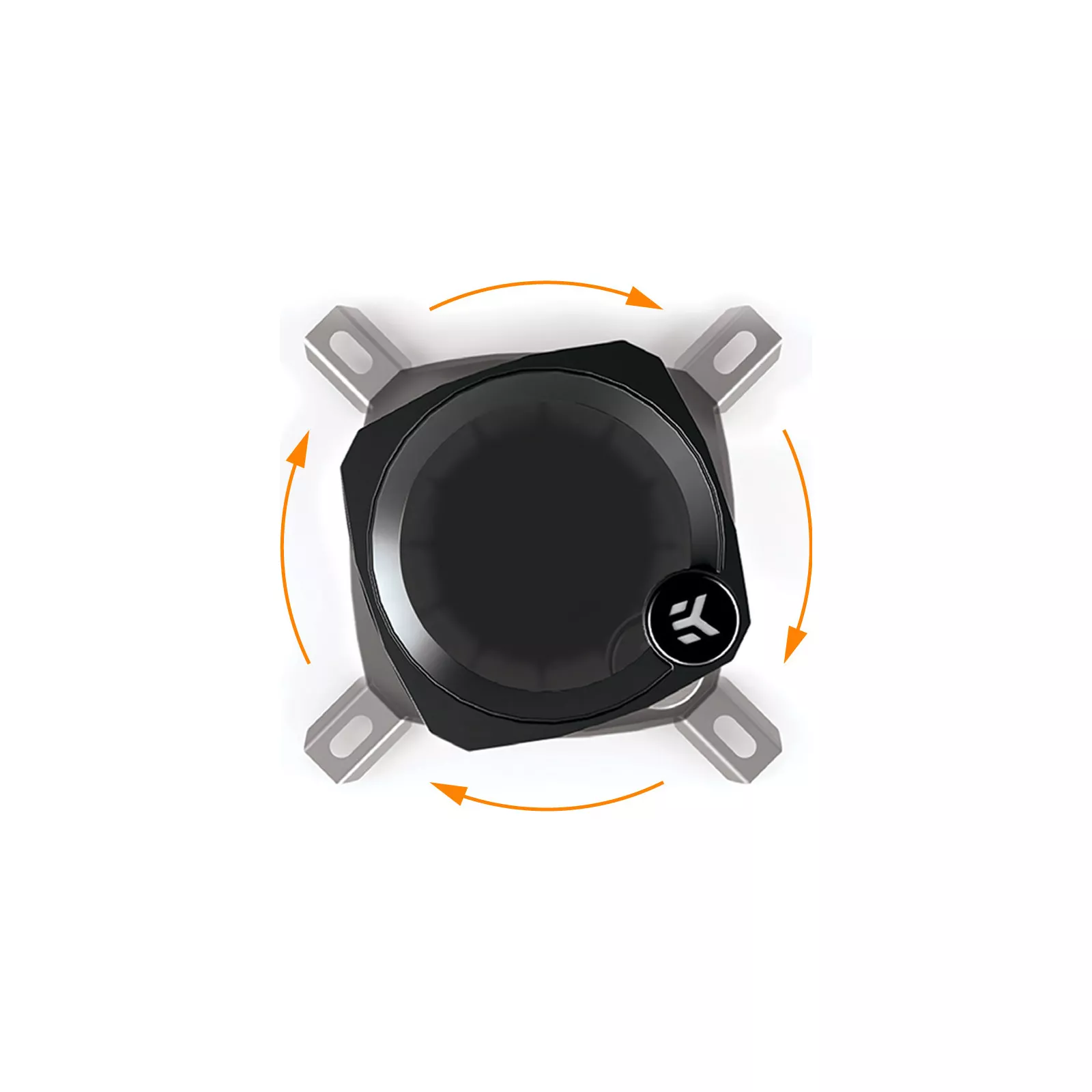 Верхняя часть вращающейся помпыВерхняя часть позволяет переориентировать значок D-RGB EK независимо от того, в каком направлении установлен кулер. Ориентацию можно изменять с шагом 90, поэтому, если кулер установлен ногами вверх, поверните его на 180 градусов, чтобы логотип отображался правой стороной вверх.