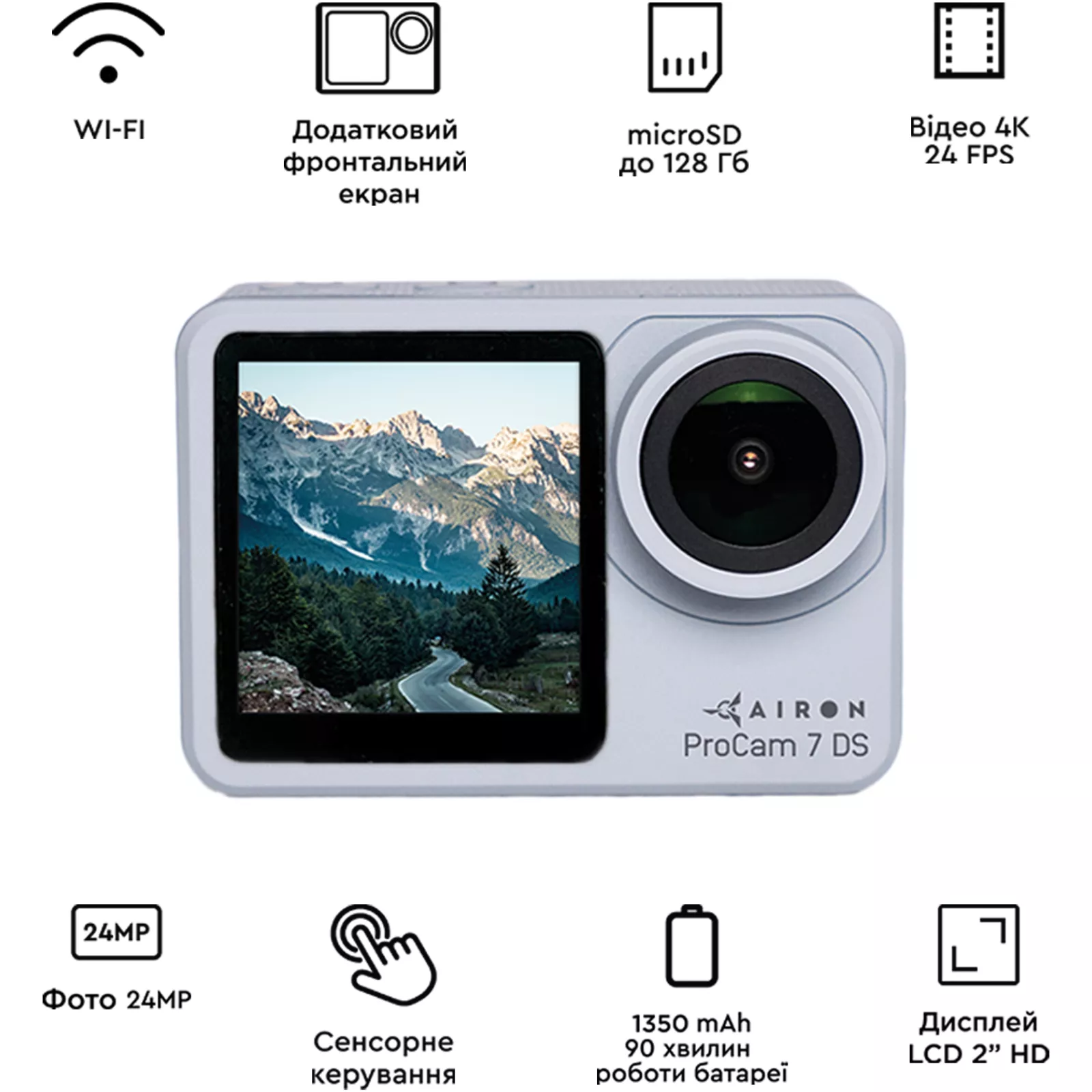 Новое инновационное предложение для всех энтузиастов видеосъемки – экшн-камера Airon ProCam 7DS нового поколения с фронтальным дисплеем LCD 1.5''. Она является главной составляющей набора блоггера 8 в 1.