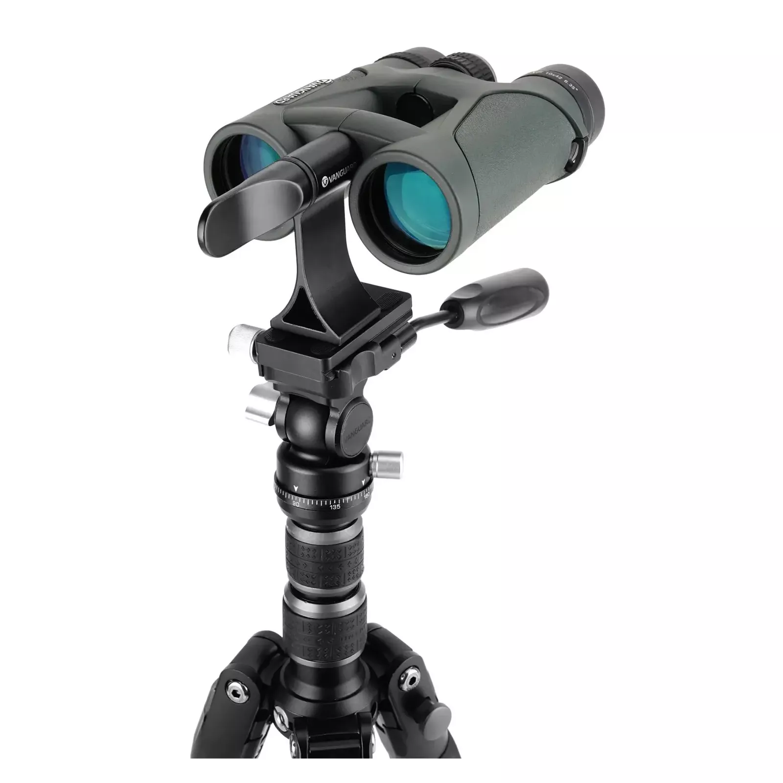 Tripod mountable. Несмотря на то, что в большинстве случаев наблюдения проводятся с биноклем в руках, бывают ситуации, когда установка на штатив просто необходима. Большие увеличения, наблюдения в течение длительного времени или съемка на камеру смартфона с помощью бинокля требуют стабильности оптического прибора. Данная модель имеет две резьбы для крепления штативного адаптера, расположенные под колпачками в переднем и дальнем шарнире.