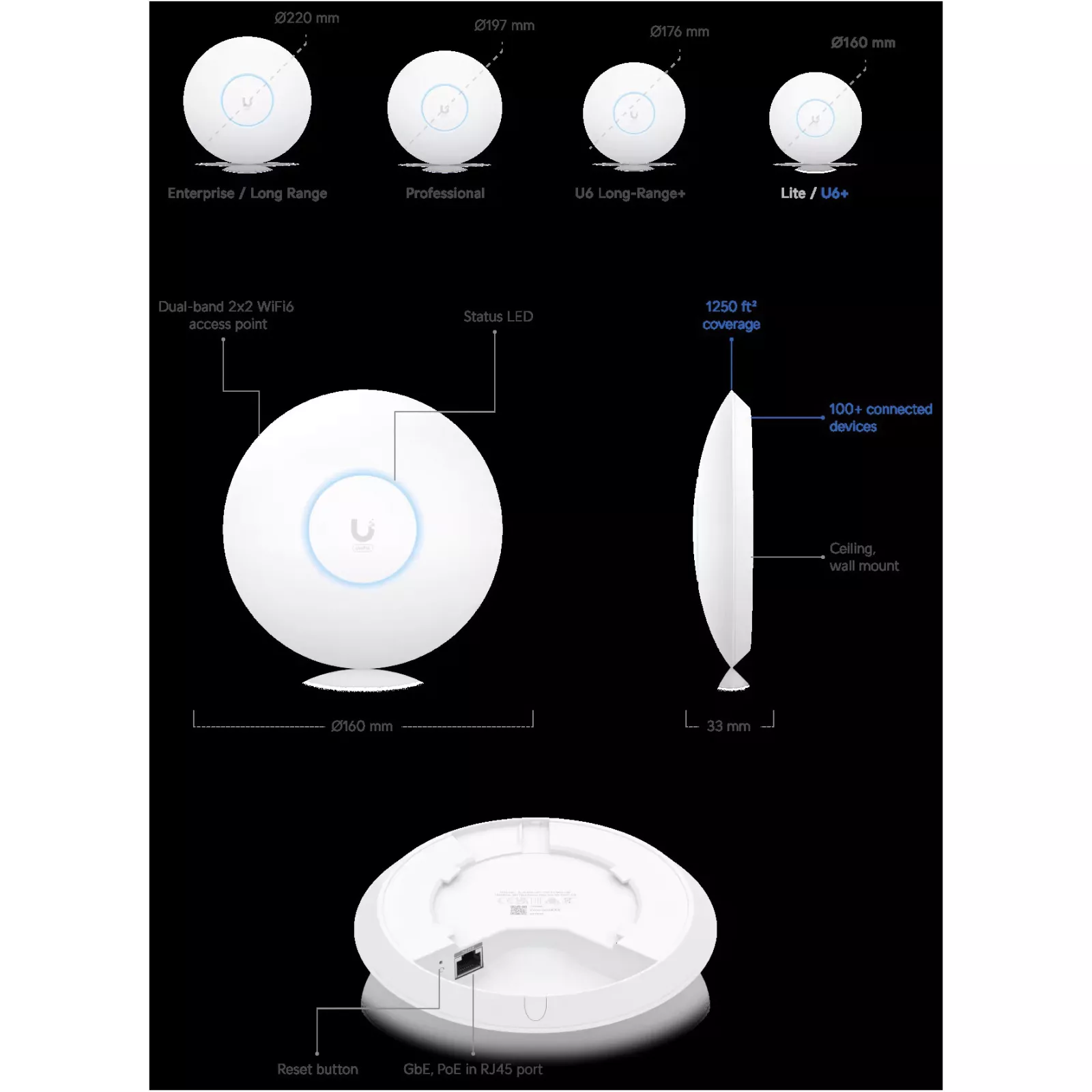 Предназначен для горизонтальной установки на потолке или вертикального монтажа на стене. UniFi 6+ может покрывать клиентскую среду с высокой плотностью размещения.