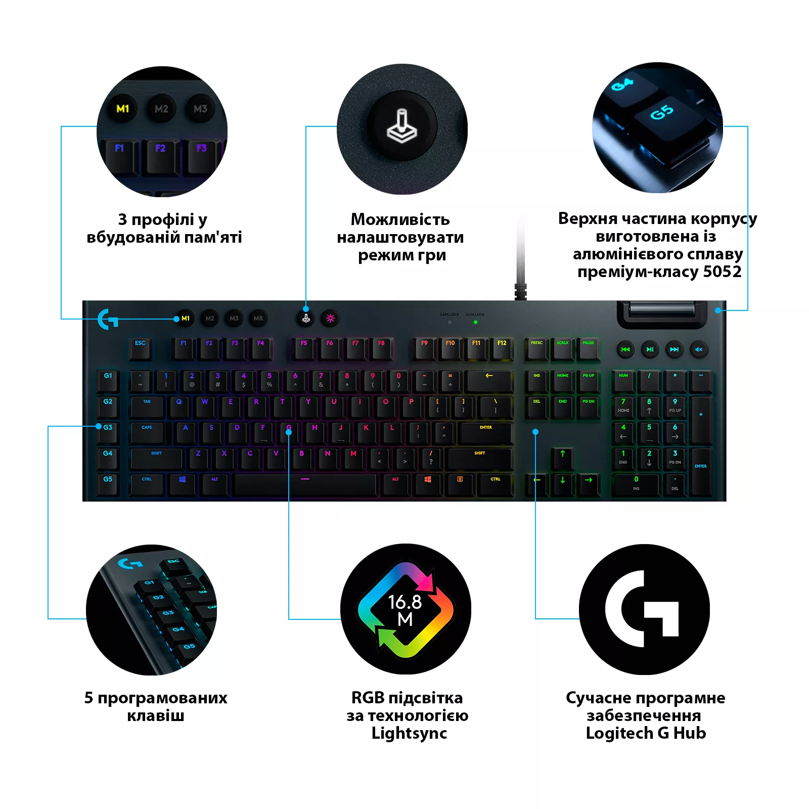 Эта совершенная ультратонкая клавиатура воплотила в себе новейшие игровые технологии. Она оборудована специальными G-клавишами и RGB-подсветкой по технологии LIGHTSYNC, а все параметры ее работы можно настроить. Чтобы удовлетворить запросы самых требовательных игроков, разработчики оборудовали ее плоскими механическими переключателями GL, доступными в нескольких разновидностях: с линейным ходом, с тактильным откликом или щелчком при срабатывании. Ознакомьтесь с клавиатурой G815 и откройте для себя новое измерение качества игры.