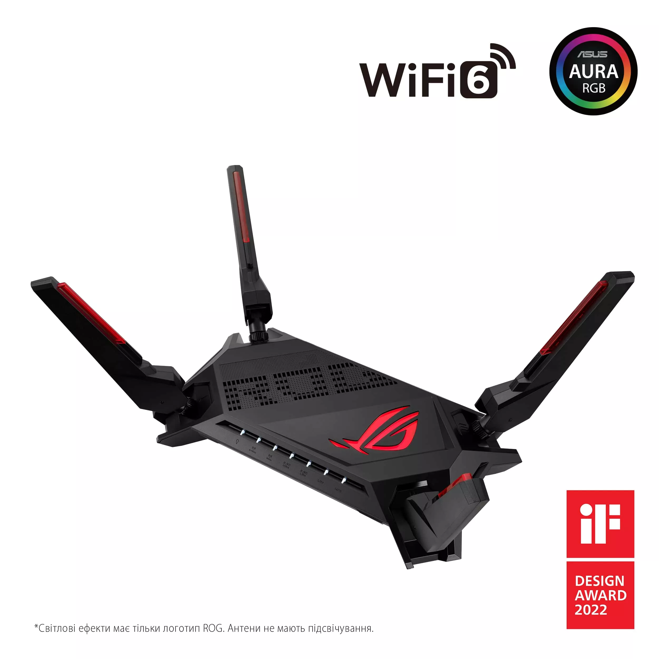 Произведенный в футуристическом стиле, игровой роутер ROG Rapture GT-AX6000 позволяет подключать еще больше устройств одновременно и вывести впечатление от игр на новый уровень. Благодаря стандарту Wi-Fi 6 с поддержкой максимальной скорости передачи 6000 Мбит/с, он всегда готов к грандиозным баталиям. Потрясающий дизайн с новыми съемными антеннами красного и черного цвета и RGB-эффектами ASUS Aura ставит маршрутизатор GT-AX6000 действительно в центр внимания!
