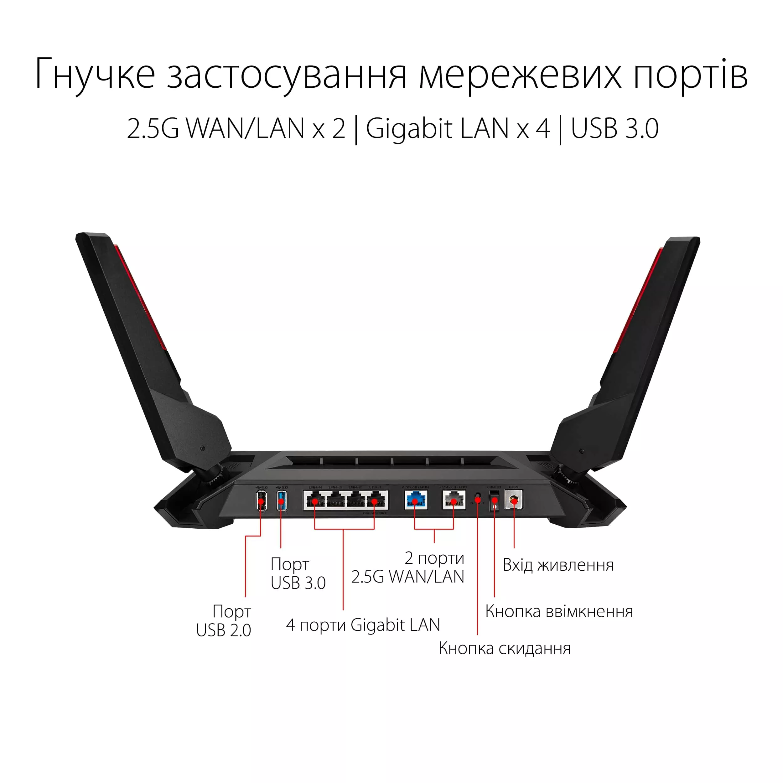 GT-AX6000 имеет два порта Ethernet с пропускной способностью 2,5 Гбит/с, которые поддерживают функции объединения каналов и балансировки нагрузки, что дает вам гибкость выбора: предоставить максимальную пропускную способность подключенным устройствам или воспользоваться преимуществами суперскоростного подключения к Интернету.