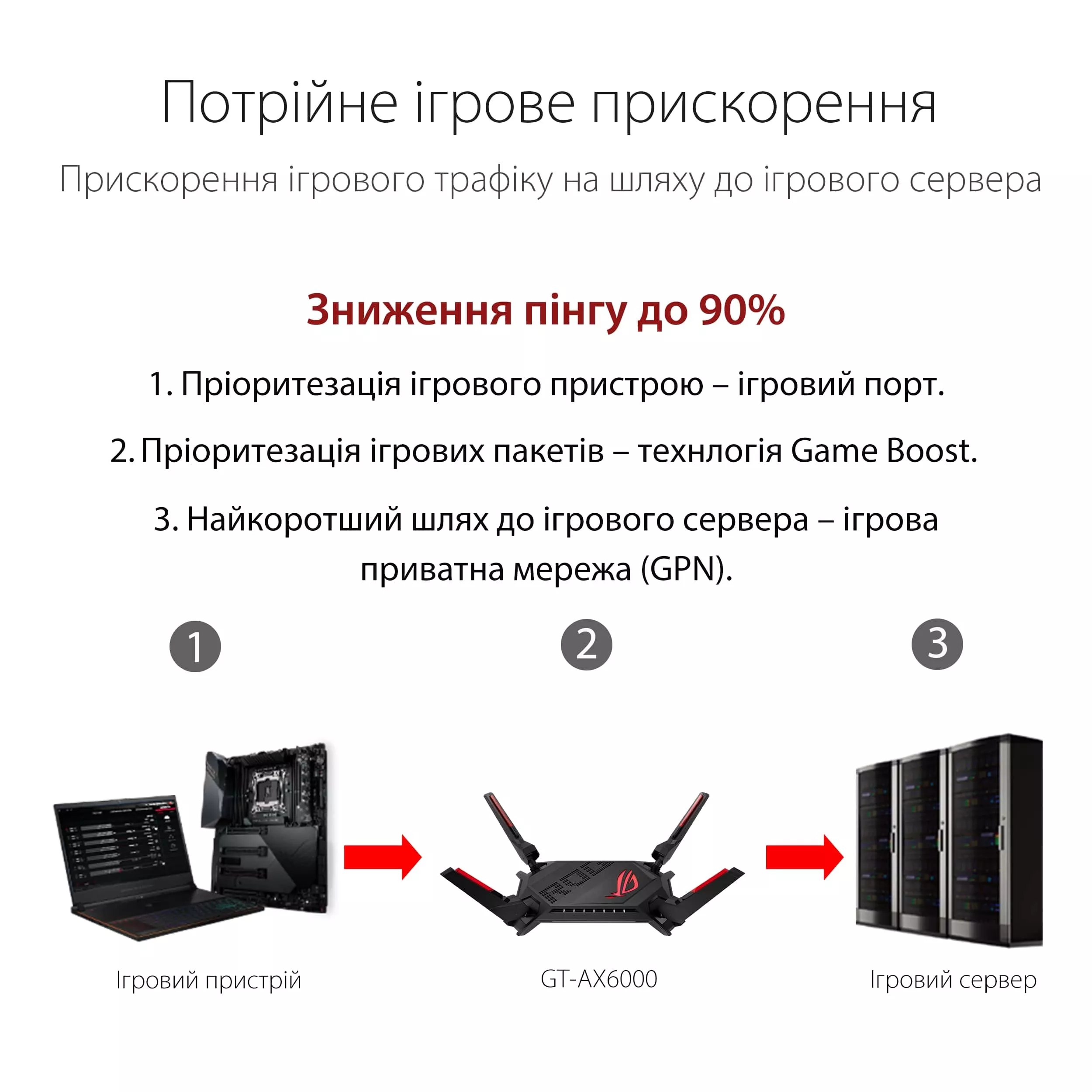 GT-AX6000 ускоряет игровой трафик на каждом шагу по пути от ПК к игровому серверу. Эта эксклюзивная технология улучшает стабильность соединения, улучшая синхронизацию с сервером, уменьшая задержку, снижая пинг и увеличивая скорость для новых игровых впечатлений.
