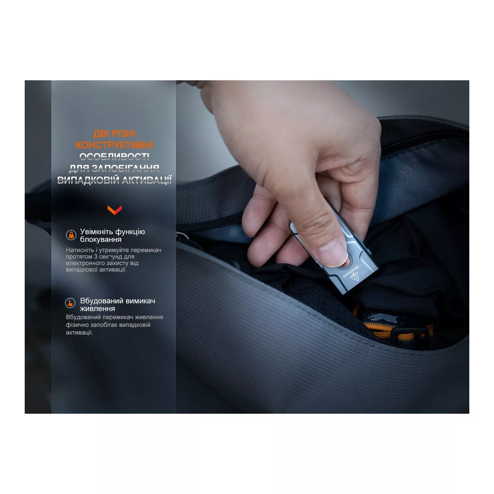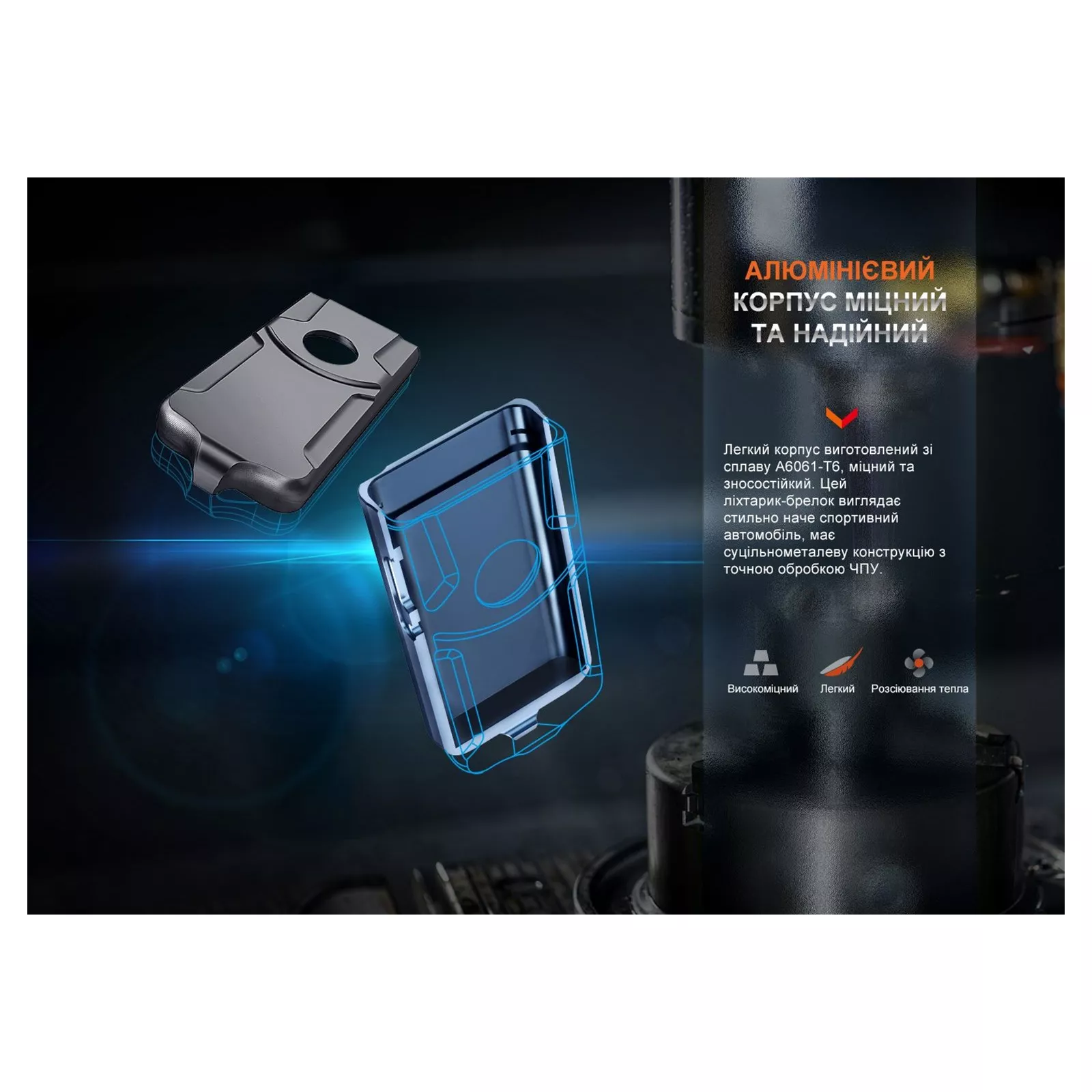 Электронный переключатель расположен поближе к голове корпуса, чтобы пользователю было удобно нажимать его большим пальцем. Кнопка имеет ребристую поверхность медного оттенка. Для управления достаточно последовательно кликать переключатель, изменяя доступные яркости. Аккумулятор не имеет «эффекта памяти» и невосприимчив как к низким, так и к высоким температурам. В комплект входит кабель USB, подключаемый к порту Type-C. Статус аккумулятора отображает индикатор, включенный в переключатель. После зарядки нужно закрывать порт силиконовой заглушкой, чтоб в него не попала вода и маленькие песчинки. позволяет использовать фонарь во время осадков. В производстве конструкции применяется легкий и нержавеющий металл – авиационный алюминий с жестким покрытием в виде анодирования. Модель удобно носить в кармане сумки или одежды, крепить на лямку рюкзака или связку ключей, так как вес конструкции едва достигает 30 граммов. Для этого можно продвинуть в хвостовое отверстие темляк или металлическое кольцо из комплекта. Длина корпуса составляет 52.5 миллиметров, ширина – 26 миллиметров, а толщина – 13 миллиметров..