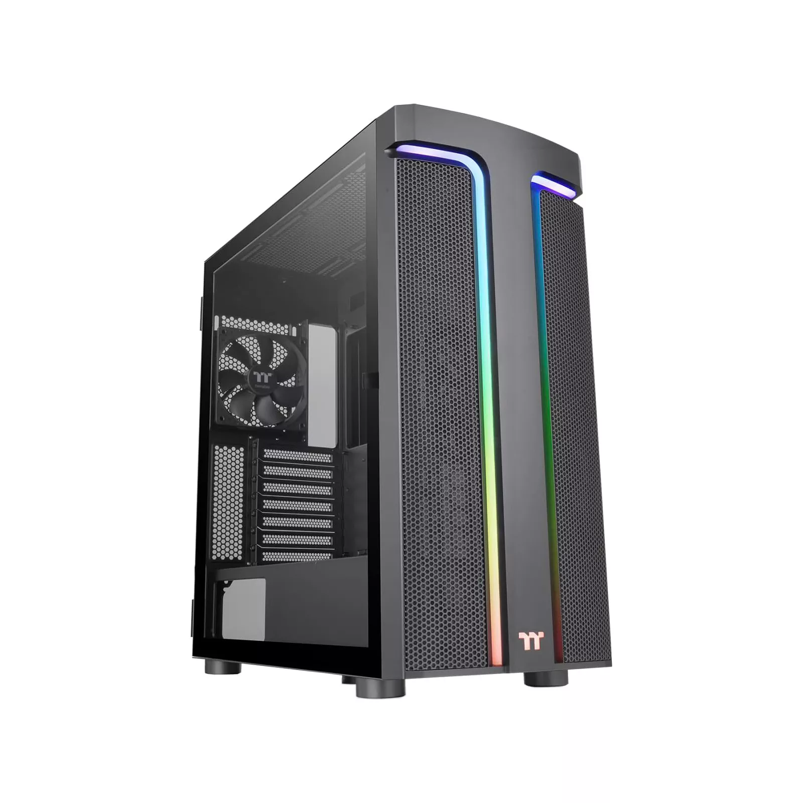 Корпус H590 TG ARGB Mid-tower имеет уникальный дизайн передней панели с двумя RGB полосками, образующими форму буквы "Т". Управление подсветкой можно с помощью физической кнопки RGB на панели ввода/вывода или через программное обеспечение для материнских плат ASUS, GIGABYTE, MSI и ASRock, имеющих интерфейс для подключения адресных светодиодных лент с питанием 5 В.