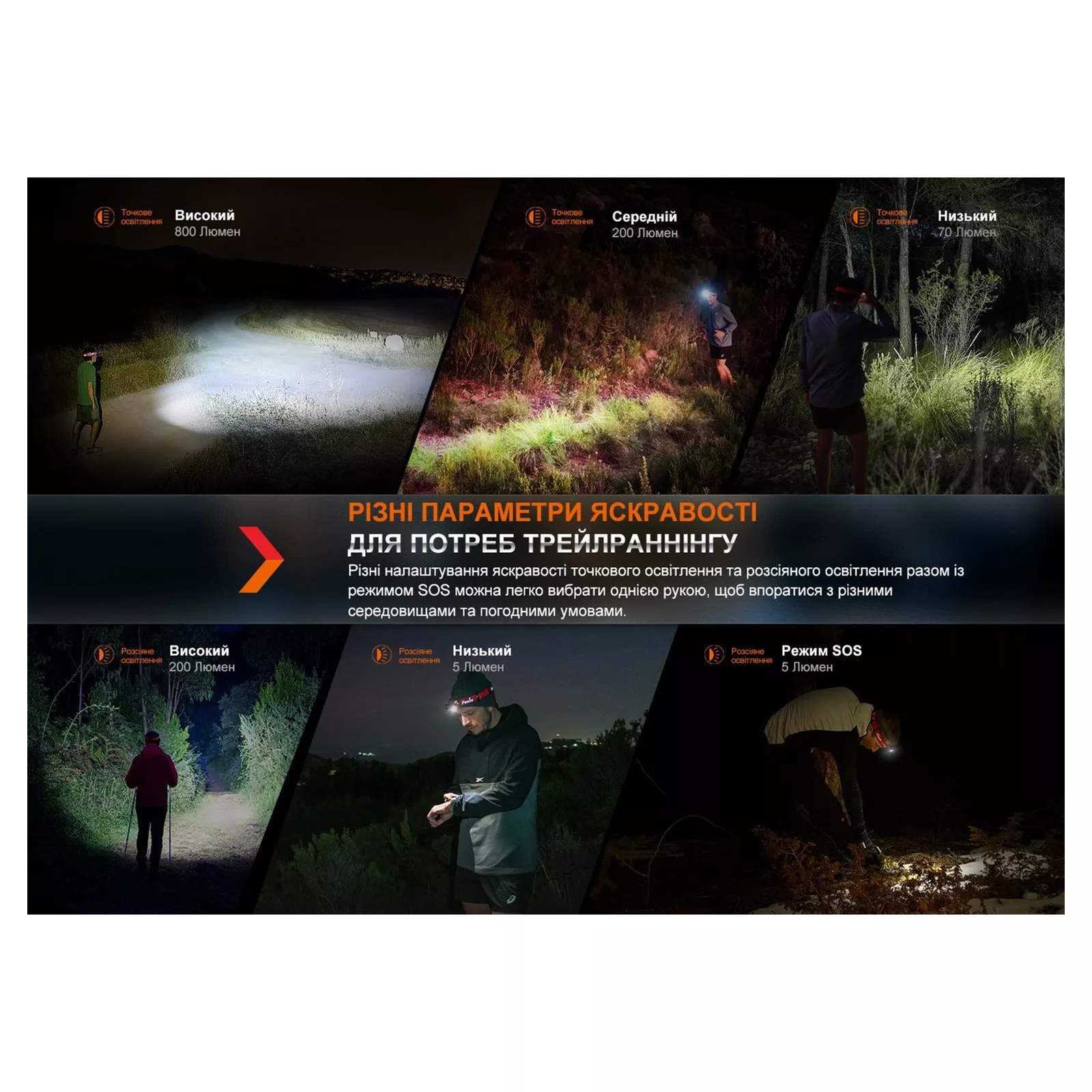Режимы работы: В дальнобойную группу входит три режима яркостью от 70 до 800 люменов, а в группу с ближним светом — четыре варианта света, включая мигающий SOS.