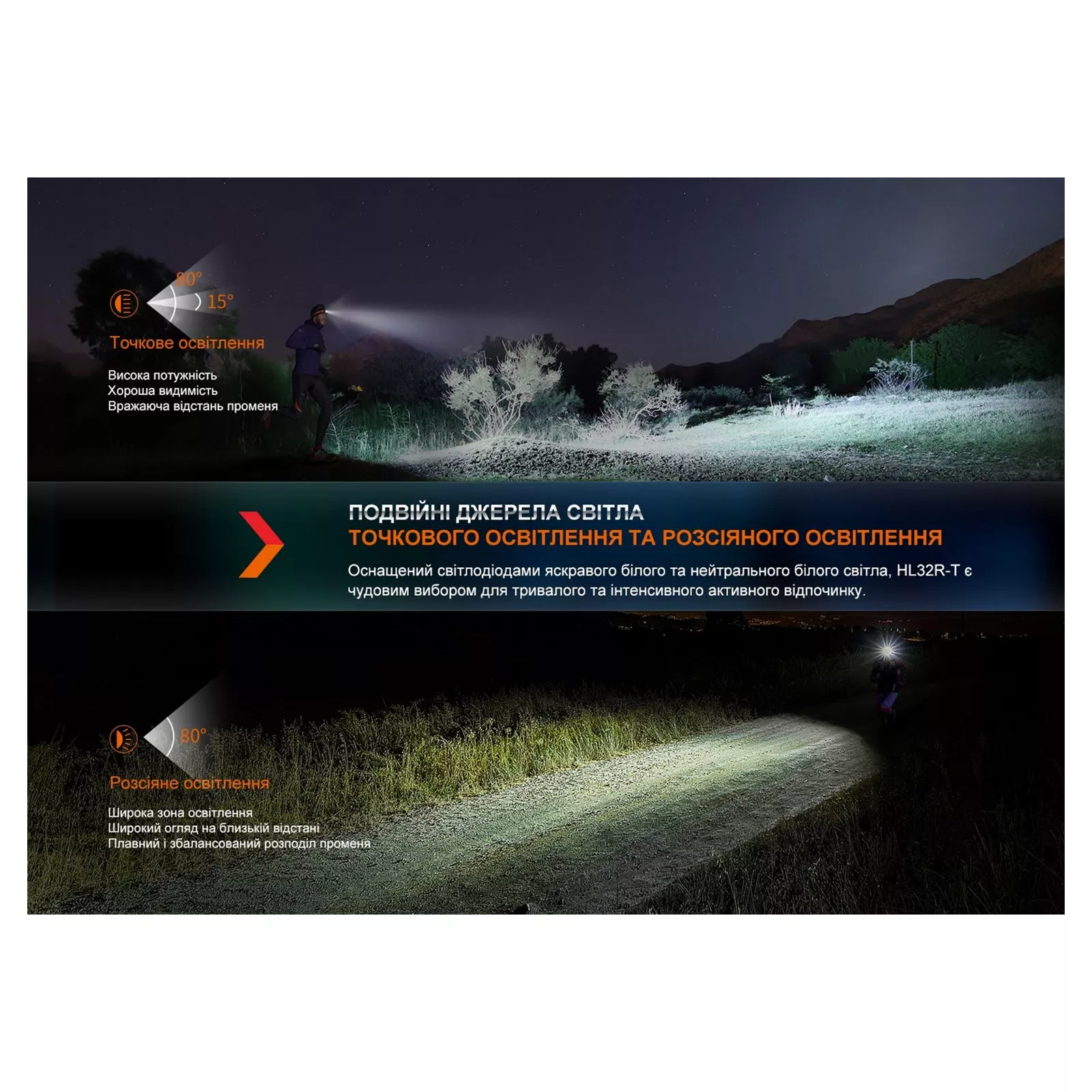 Создана специально для трейлраннеров и просто любителей активного отдыха, налобная модель HL32R-T отличается не только яркостью и разнообразием генерируемого света, но и облегченной конструкцией для более удобной эксплуатации. Фонарь оснащен и укомплектован двумя диодами с разной цветовой температурой освещения: Luminus SST20 – 6500К, Redslight – 4000К. Каждый диод управляется отдельным переключателем, вынесенным в верхнюю часть конструкции. Максимальная яркость модели составляет 800 люмен, а дальность света достигает 132 метров.