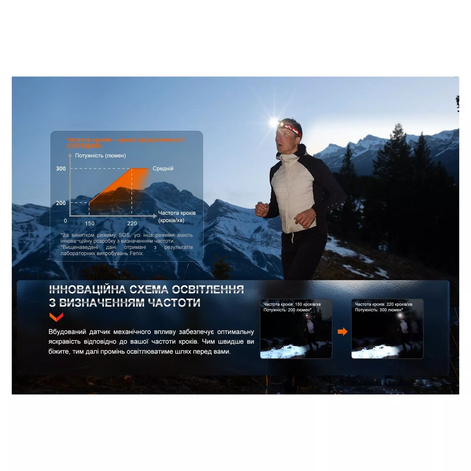 В модель встроен датчик (индикатор), который отслеживает частоту шага пользователя и автоматически регулирует мощность освещения в зависимости от скорости передвижения. Например, при скорости 150 шагов в минуту фонарь будет светить с яркостью 200 люменов, а при ускорении до 220 шагов в минуту этот показатель увеличится до 300 люменов.