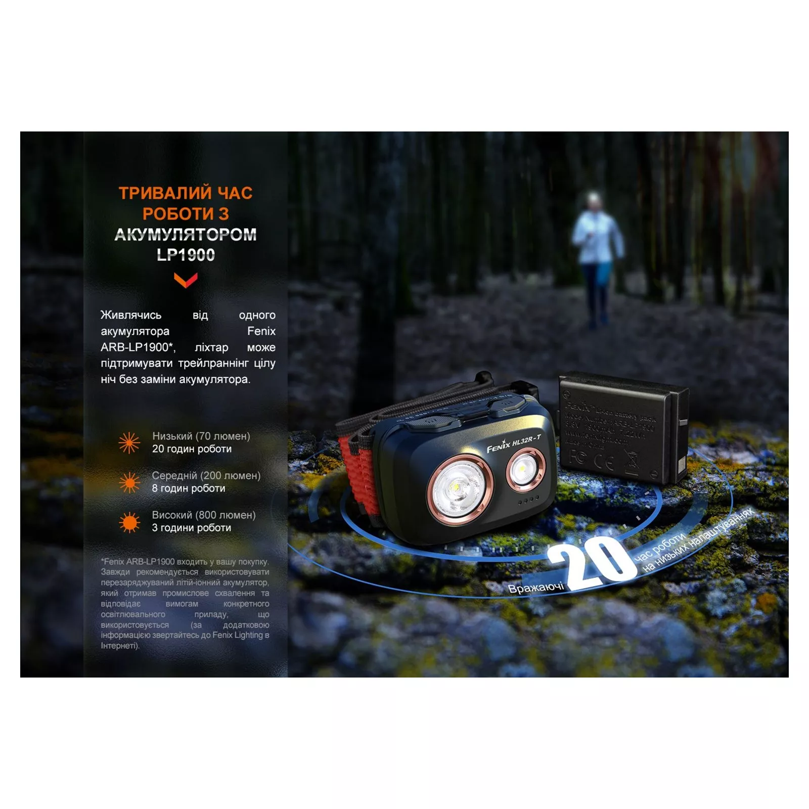 Комплектация: Налобный фонарь Fenix HL32R-T, аккумуляторный блок питания ARB-LP1900, кабель USB Type-C для зарядки, гарантия, инструкция по использования.