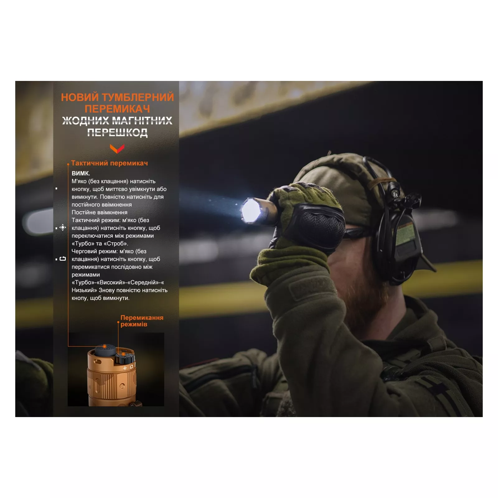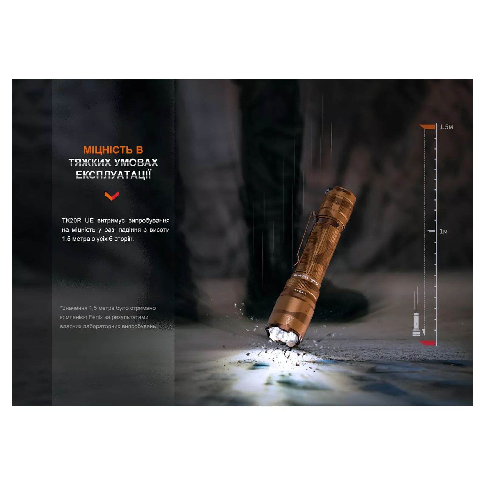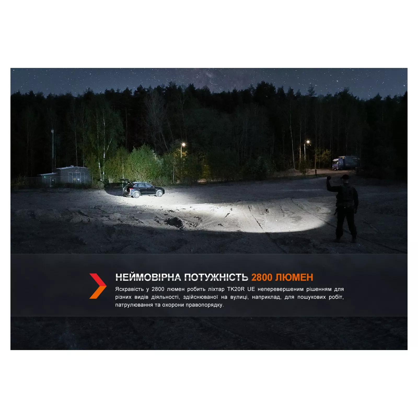 Цветовая температура генерируемого луча равна 6500К. Холодный белый свет характеризуется увеличенной дальнобойностью, которая в данной модели достигает почти полкилометра. Fenix TK20R имеет несколько полезных опций. Среди них есть защита от перегрева. В тактическую группу входит несколько основных вариантов освещения: Турбо и мигающий стробоскоп, который предназначен для моментальной дезориентации противника, а также подходит для подачи световых сигналов. Служебная группа включает в себя четыре режима с постоянным освещением мощностью от 30 люмен и выше.