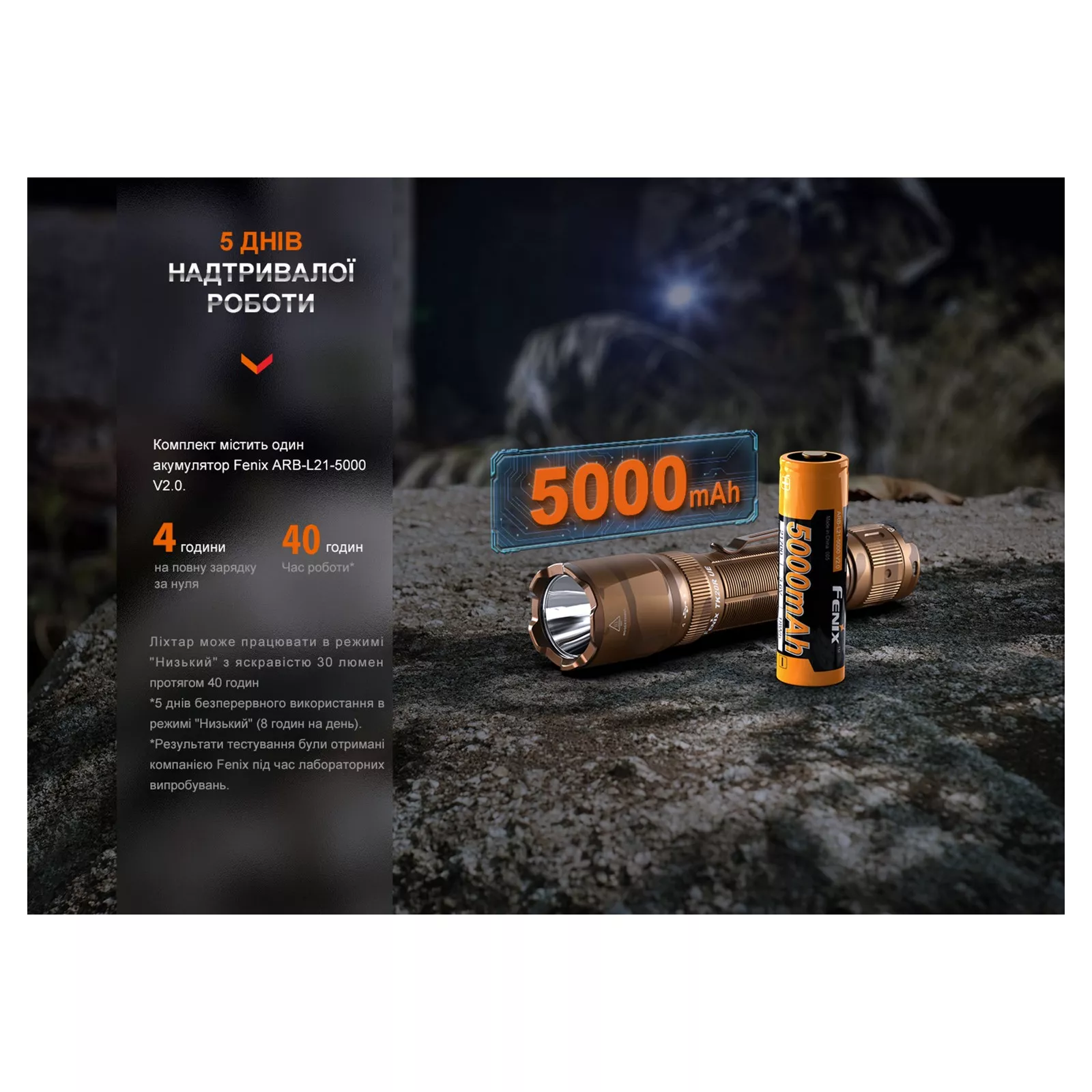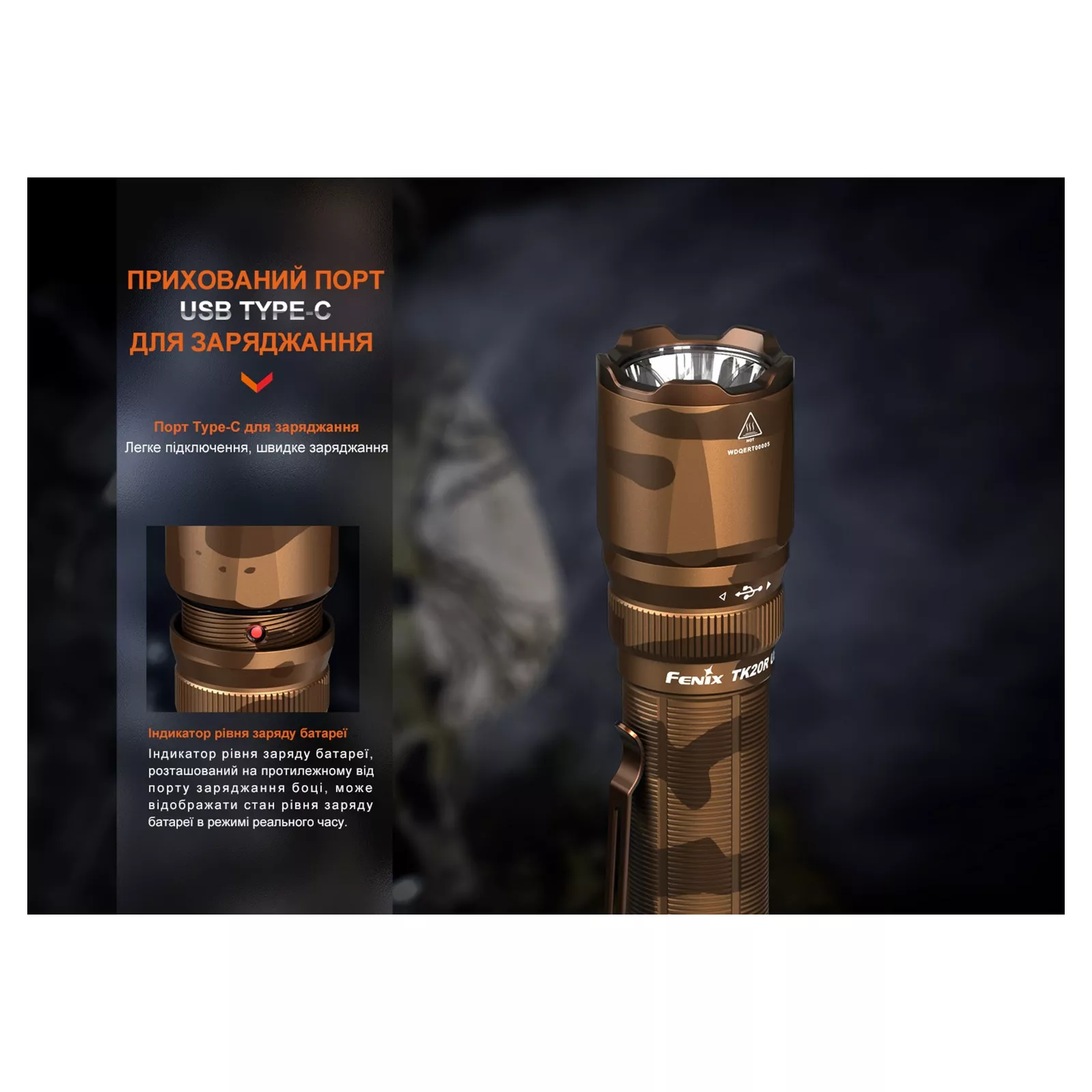 Фонарь Fenix TK20R UE, аккумулятор ARB-L21-5000 V2.0, кабель USB Type-C для зарядки, два запасных уплотнитель, темляк, чехол, инструкция пользователя, гарантийный талон.