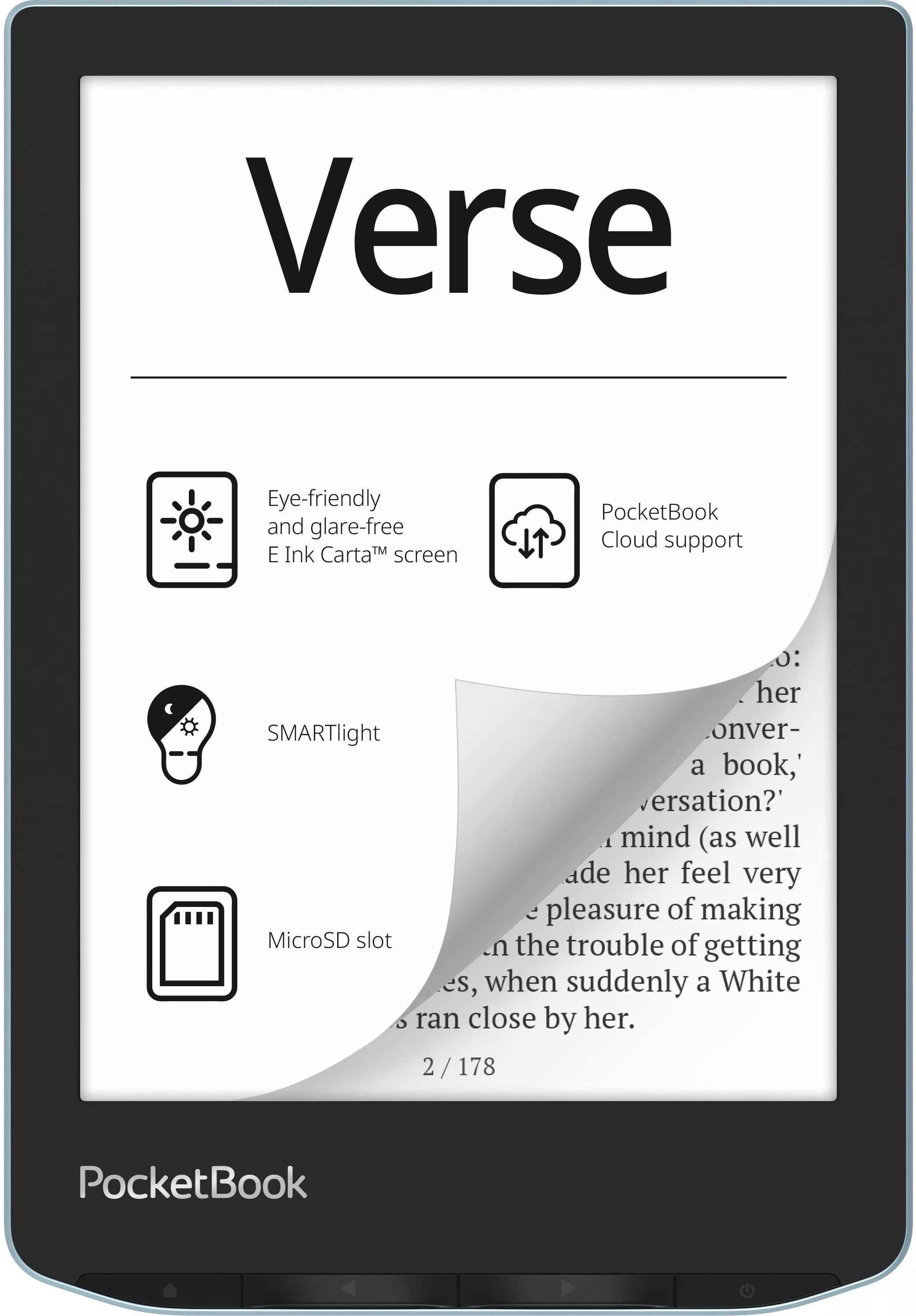 PocketBook Verse &mdash ; идеальный компаньон для упорных читателей. Благодаря 6-дюймовому сенсорному HD экрану E Ink Carta™ читать удобно и приятно. Высококачественный дисплей дарит комфорт, максимально похожий на чтение из бумаги, обеспечивая часы чтения без напряжения глаз или потери концентрации. Попрощайтесь с бликами на ярком солнечном свете, ведь E Ink дисплей ридера позволяет читать где угодно и когда-либо. Его идеальная четкость и читабельность словно оживляет каждое слово на странице.