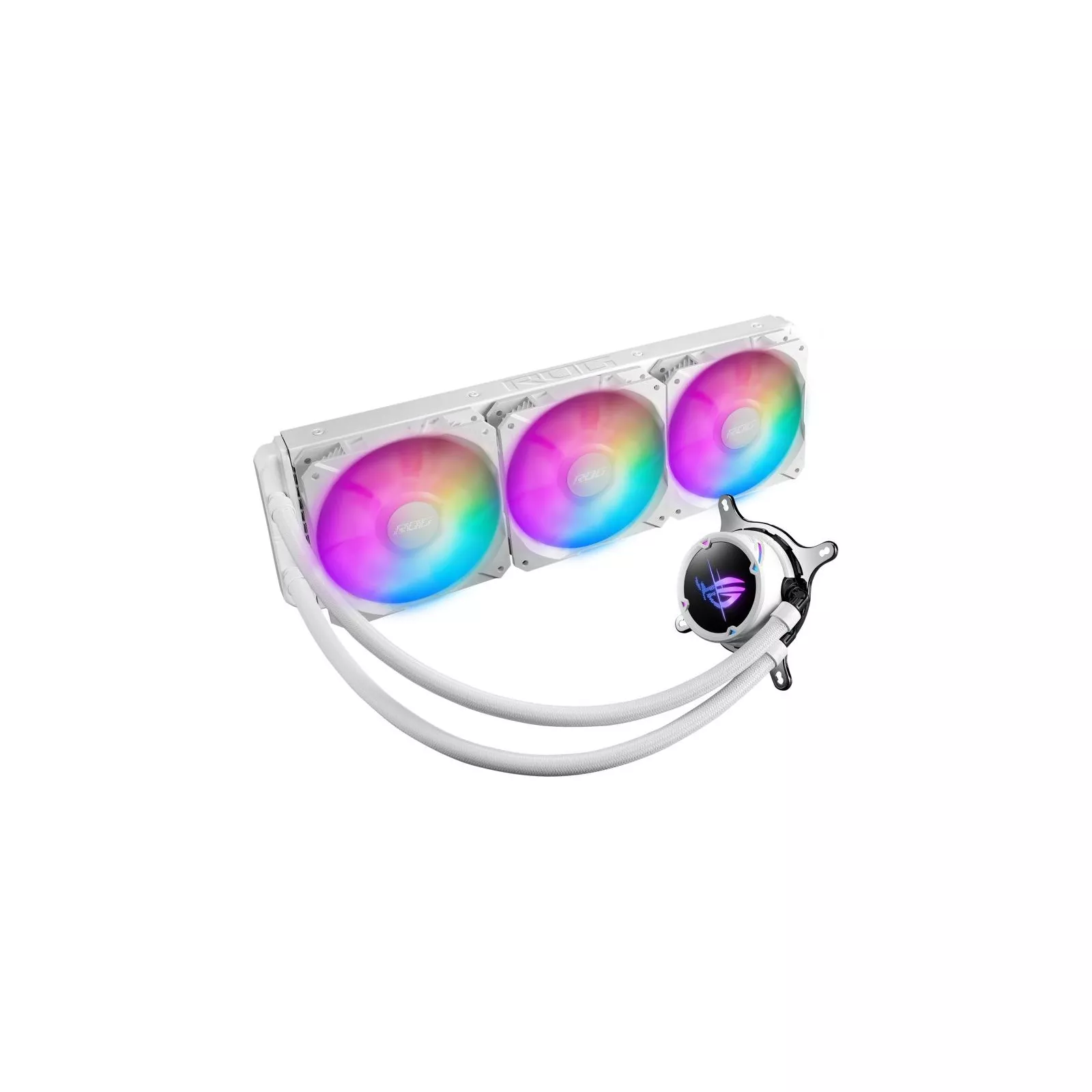 ROG Strix LC II 360 ARGB — это высокопроизводительная система водяного охлаждения процессора, позволяющая раскрыть весь потенциал процессоров Intel и AMD. В ней использована конструкция с замкнутым контуром, и при этом она оснащена и укомплектована многоцветной подсветкой с поддержкой нескольких визуальных эффектов. Подсвечиваемый логотип ROG на крышке насоса поддерживает технологию Aura Sync, позволяющую синхронизировать визуальные эффекты с другими Aura-совместимыми устройствами и компонентами. Выгравированная надпись ROG на боковой поверхности радиатора гармонично дополняет мерцающие буквы на втулках вентиляторов.