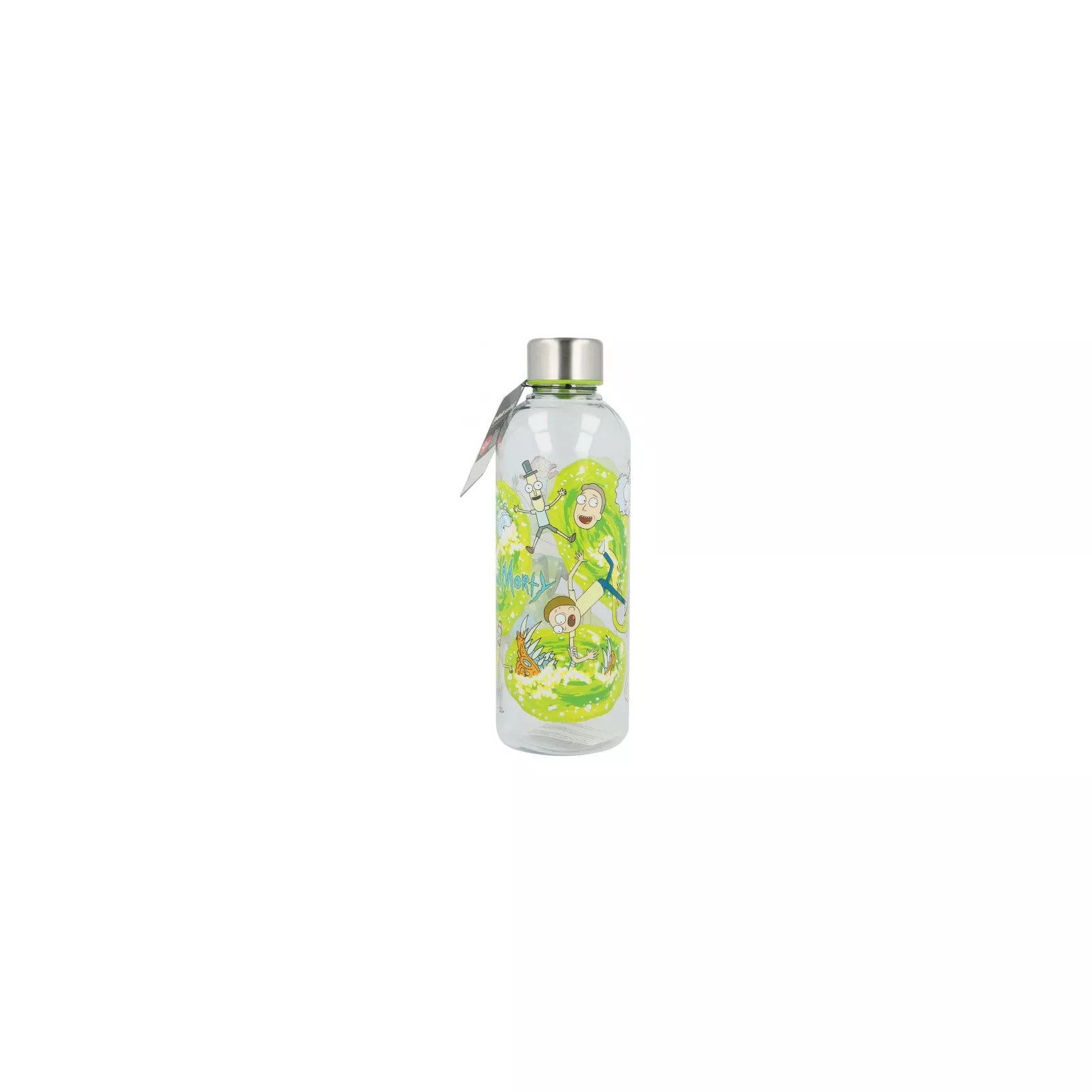 Пластиковая бутылка для воды по мотивам популярного мультфильма Rick and Morty. Общий объем: 850 мл. Металлическая крышка с резьбой для большего удобства использования.
