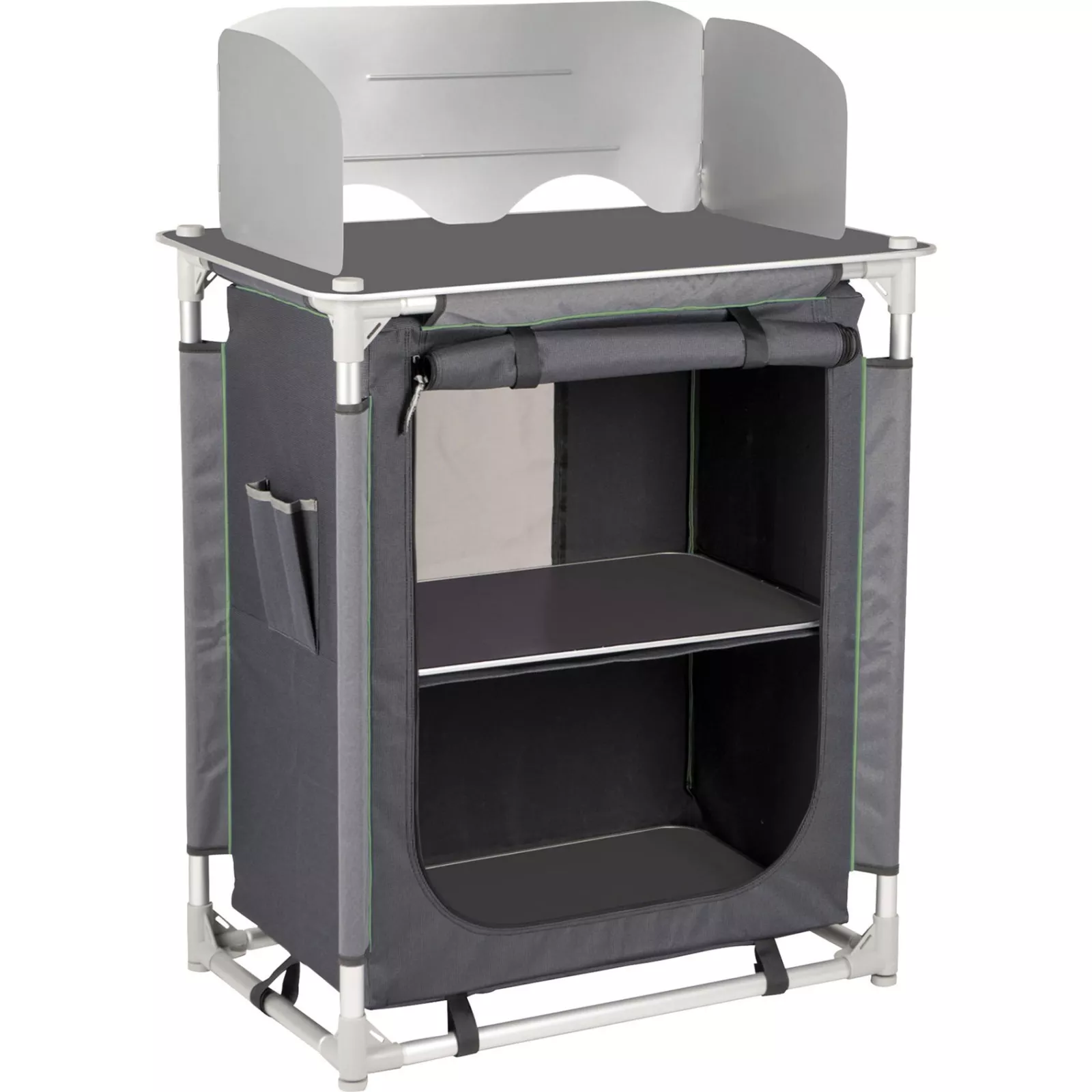 Даже отдыхая на природе, можно готовить с комфортом. В этом поможет удобная раскладная кухня Bo-camp Moraine с ветрозащитным экраном в комплекте. Ее столешница выполнена из алюминия и является гигиенической, жаро-и влагостойкой. Вы можете смело поставить на нее газовую или электроплитку, горячую кастрюлю, мыть и нарезать овощи. Легкий каркас кухни выполнен из алюминия с привлекательным порошковым покрытием серого цвета. А регулировка ножек поможет выставить ее стойко на любой поверхности. Для хранения посуды и продуктов предусмотрен закрывающийся на молнию текстильный шкафчик с двумя полками из прочного материала полиэстер Оксфорд 600D, который выглядит как настоящая хлопчатобумажная ткань. Боковые карманы-органайзеры помогут разместить кухонные мелочи, необходимые на каждой кухне. Состоит кухня в компактный чехол толщиной всего 13 см, который легко поместится в машине и не займет много места у вас дома.