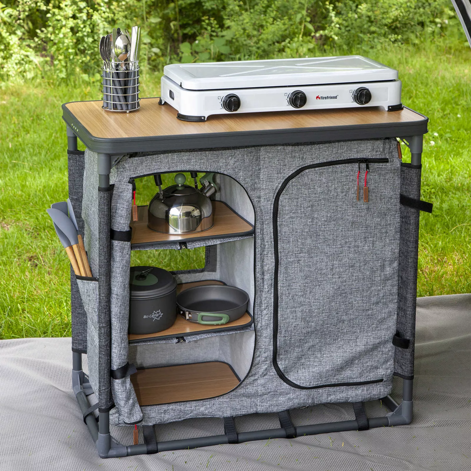 Отдыхая на природе, всегда хочется взять с собой домашний уют и комфорт. В этом вам поможет стильная раскладная кухня Bo-camp Hampton Anthracite. Ее столешница, выполненная из МДФ, жаро-и влагостойкая. Вы сможете смело поставить плитку, горячую кастрюлю, мыть и нарезать овощи. Каркас кухни из алюминия со стильным порошковым покрытием серого цвета. А регулировка ножек поможет выставить ее стойко на любой поверхности. Для хранения посуды и продуктов предусмотрен закрывающийся на молнию текстильный шкаф с шестью полками из прочного материала полиэстер Оксфорд 600D, который выглядит как настоящая льняная ткань, а четыре боковых кармана-органайзера сохранят ваши кухонные мелочи, так необходимые на каждой кухне. Состоит кухня в компактный чехол, шириной всего 13 см, который легко поместится в машине и не займет много места у вас дома.