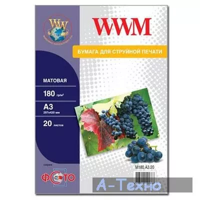WWM A3 (M180.A3.20) - фотобумага для струйной печати Матовая односторонняя, 180г/кв.м, А3, 20 л.
