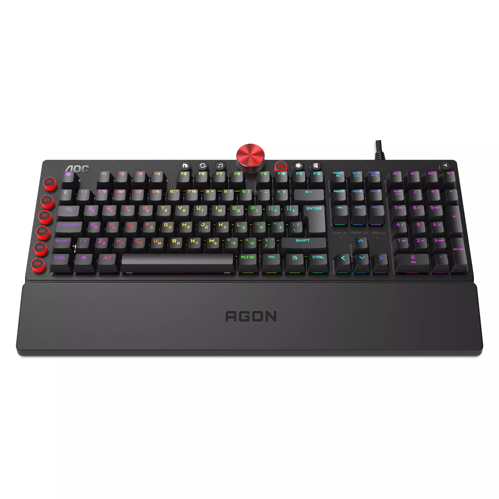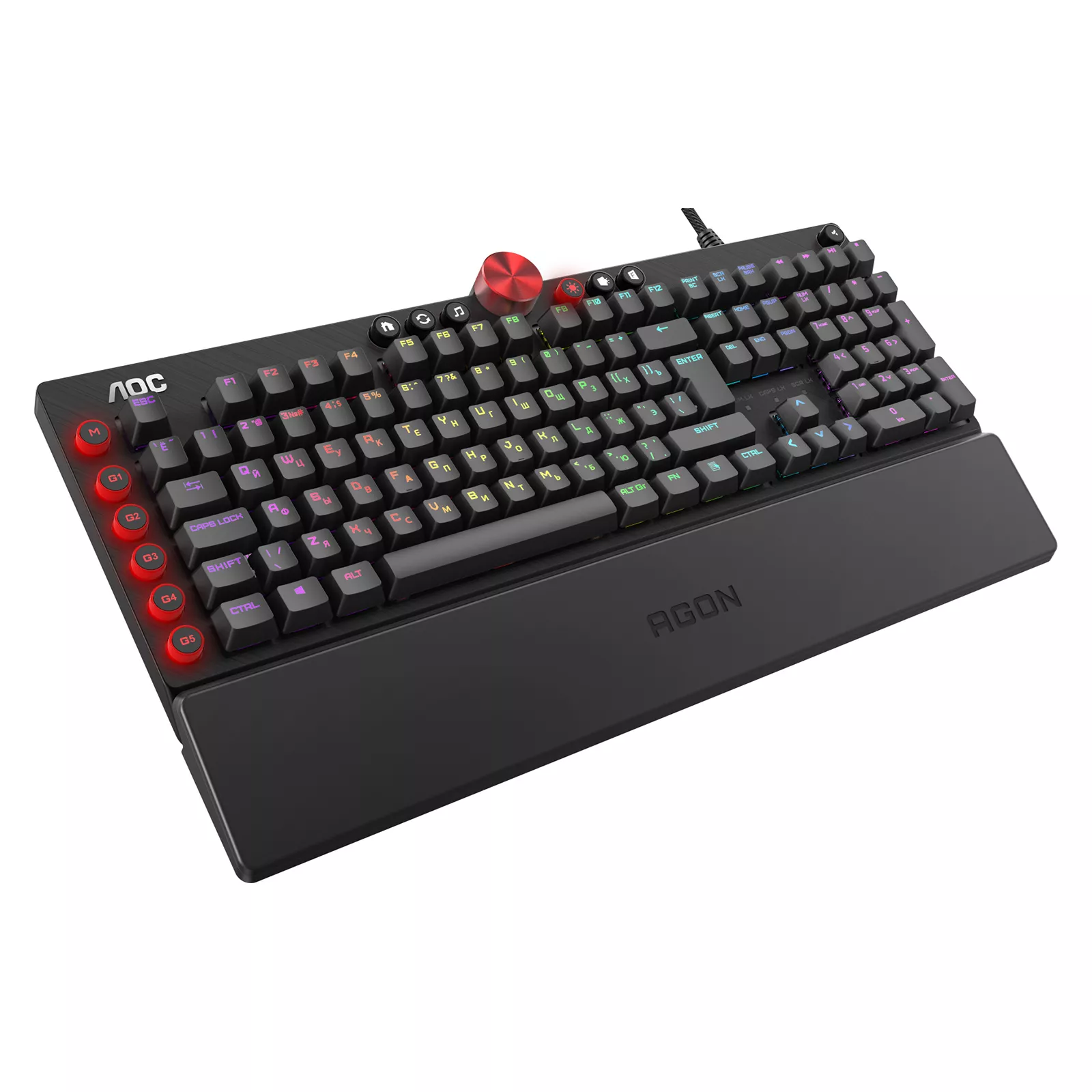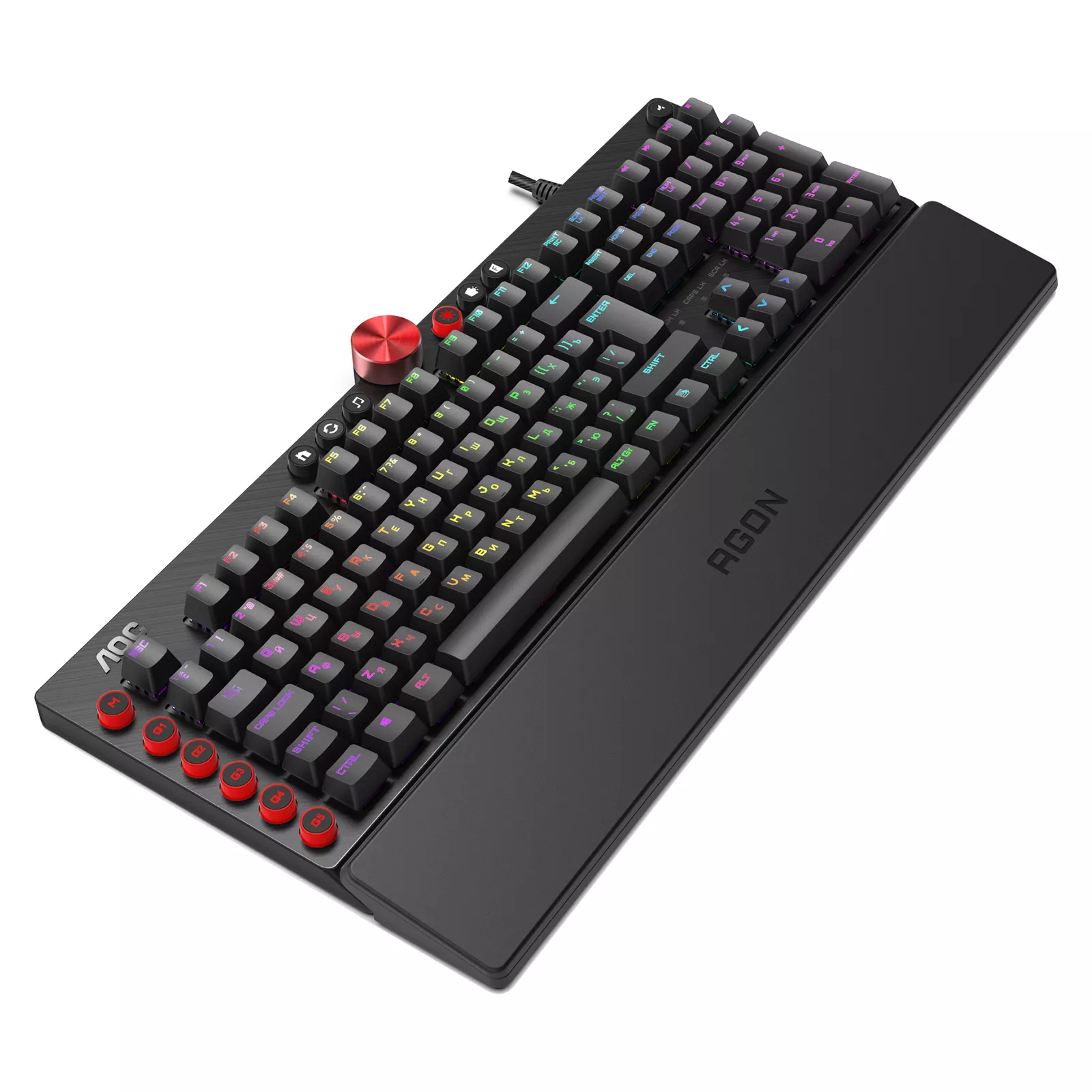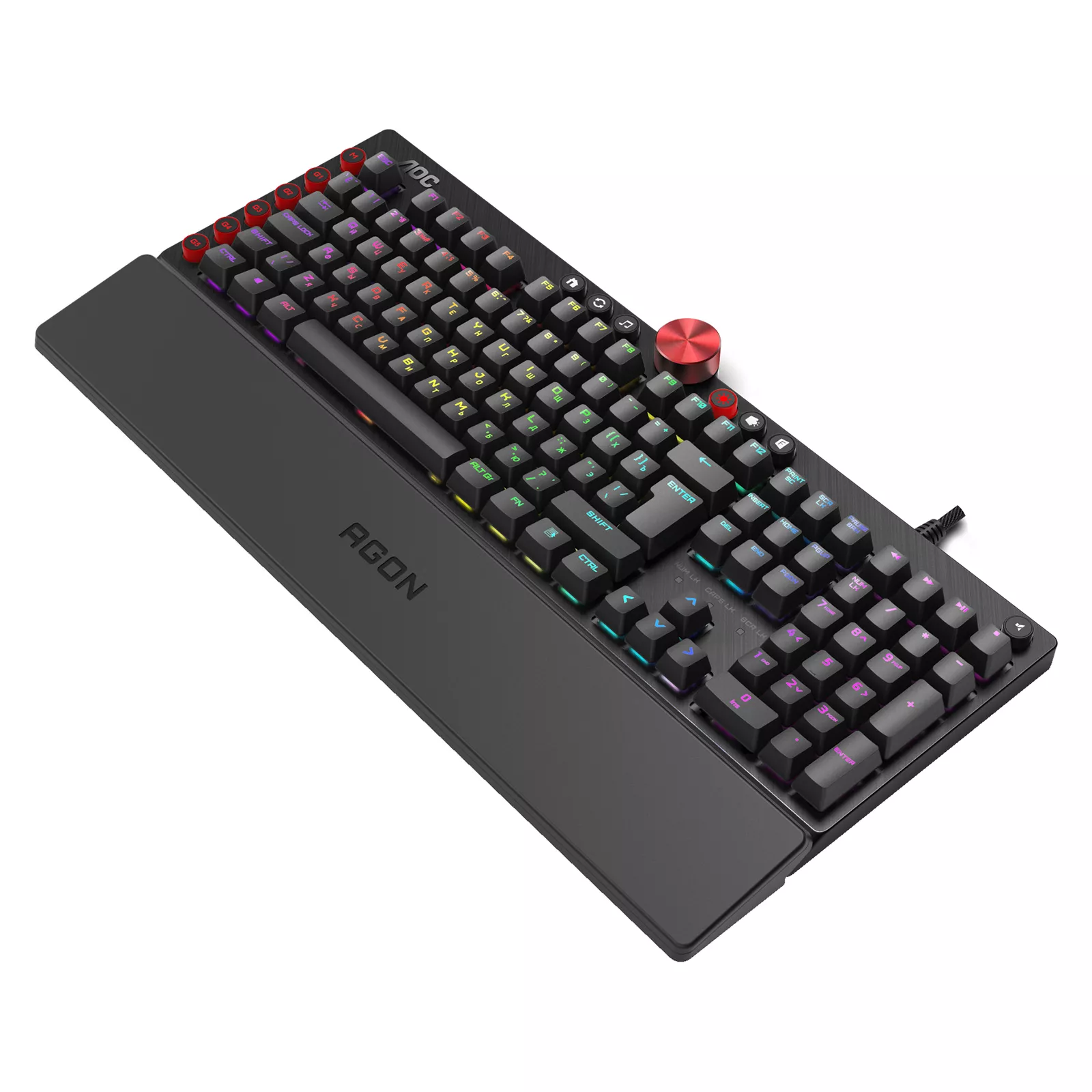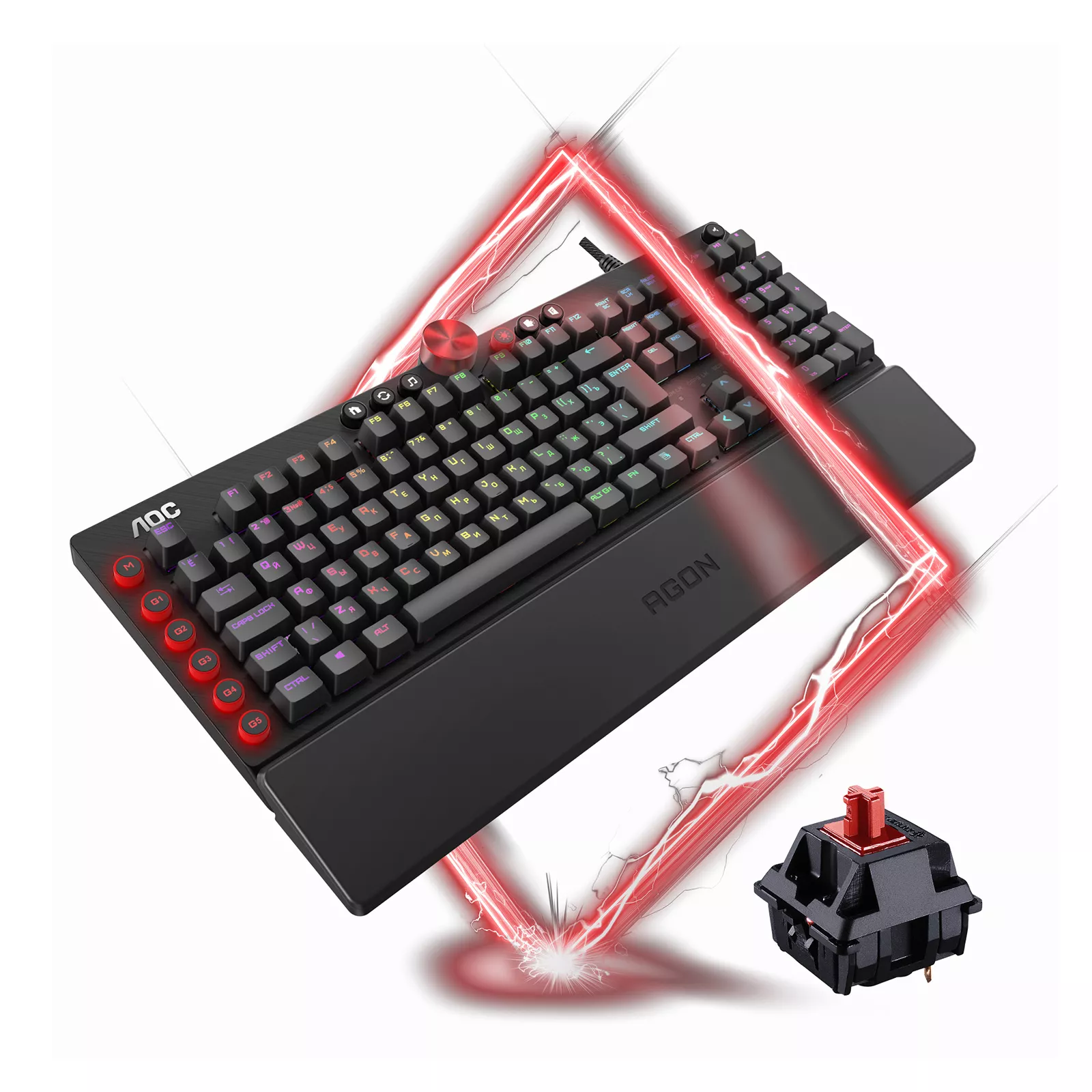 Игровая механическая клавиатура AOC AGK700 с переключателями Cherry Red Switch с молниеносной скоростью превратит все нажатия в игровые действия. Клавиатура идеально подходит для любых динамических игр, в том числе шутеров. Клавиатура оснащена и укомплектована медиаклавишами, 5 специальными макроклавишами и регулятором громкости. Все клавиши клавиатуры подлежат программированию. Программное обеспечение AOC G-Tools позволит определить функции клавиш и осуществить синхронизацию RGB подсветки.