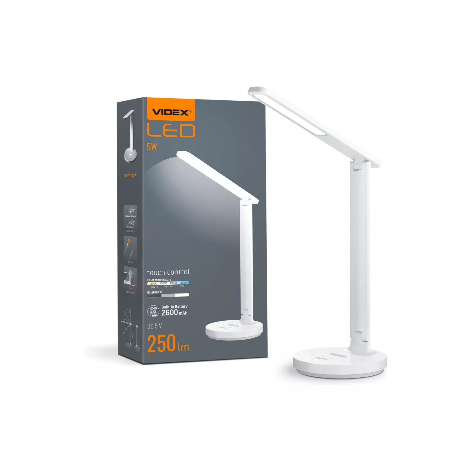 LED лампа настольная с аккумулятором VIDEX VL-TF16W 5W обеспечивает яркое и приятное освещение. С мощностью 5Вт и световым потоком в 250Лм она энергоэффективна и долговечна, обеспечивает значительную экономию электроэнергии. Одна из особенностей этой лампы – ее возможность настройки температуры света в широком диапазоне от 1800К до 5000К. Вы можете изменять цвет света от теплого и холодного белого, чтобы создать идеальную атмосферу для работы, обучения или отдыха. Для удобства использования лампа оснащена и укомплектована также дополнительным бортиком на корпусе, который служит в качестве подставки для мобильного телефона, это удобно в ситуациях, когда нужно заниматься во время онлайн-занятий. Также особенностью этой лампы являются сенсорные кнопки управления.