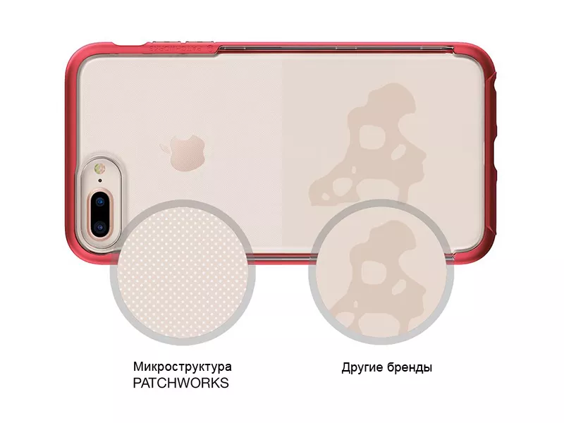 Чехол Patchworks Sentinel состоит из корпуса ТПУ и поликарбонатного бампера. Для достижения не желтеющего, прозрачного корпуса ТПУ без пятен использовались передовые технологии. Микроструктурированная поверхность предотвращает появление смазанных пятен на задней панели при установленном чехле. Поликарбонатный бампер идеально соответствует натуральным цветам iPhone. Этот мощный двухслойный чехол обеспечивает защиту военного уровня обеих сторон корпуса и также защищает основную камеру за счет приподнятых краев.