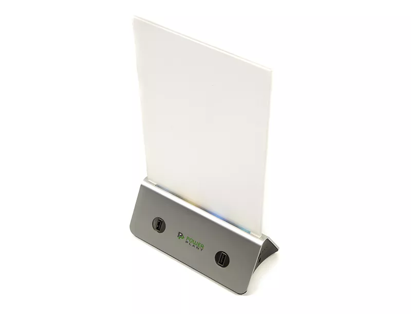 Для печатной рекламы А5 в комплекте двустворчатая акриловая подставка, которая вставляется в подстанцию. Пауэр банк подсвечивает рекламу снизу меняющейся разноцветной иллюминацией. Включить/выключить подсветку можно в нижней части устройства, рядом с противоскользящими силиконовыми ножками. Креативный Power Bank большой емкости, с многоуровневой системой защиты от перегрева и замыканий электросети, с функцией энергосбережения в режиме ожидания. Уровень его заряда видно на светодиодном индикаторе. Нейтральный внешний вид источника энергии органично вписывается во все известные современности интерьеры, а кенсингтонский замок убережет зарядную станцию от попыток