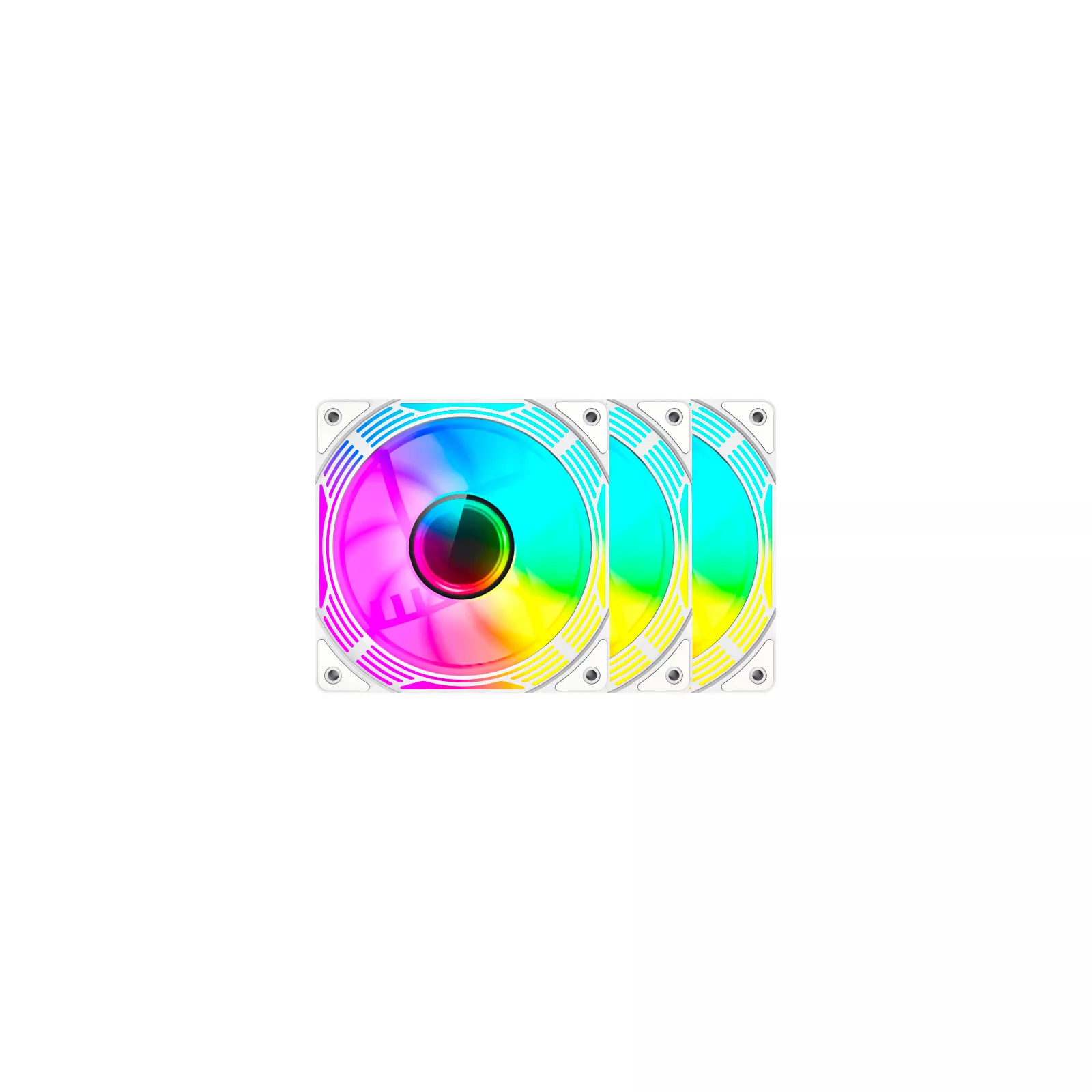 3 полнофункциональные 120-мм вентиляторы ARGB PWM. Интеллектуальная температура контролирует скорость на уровне 800~1600-10% оборотов в минуту, подключаясь к 4-контактному разъему PWM на материнской плате, поэтому скорость вентилятора автоматически контролируется и обеспечивает тихую работу вентиляторов. Эти вентиляторы представляют собой 3-контактные разъемы ARGB на 5 В, соединяемые друг за другом с ХАБом управления ARGB.
