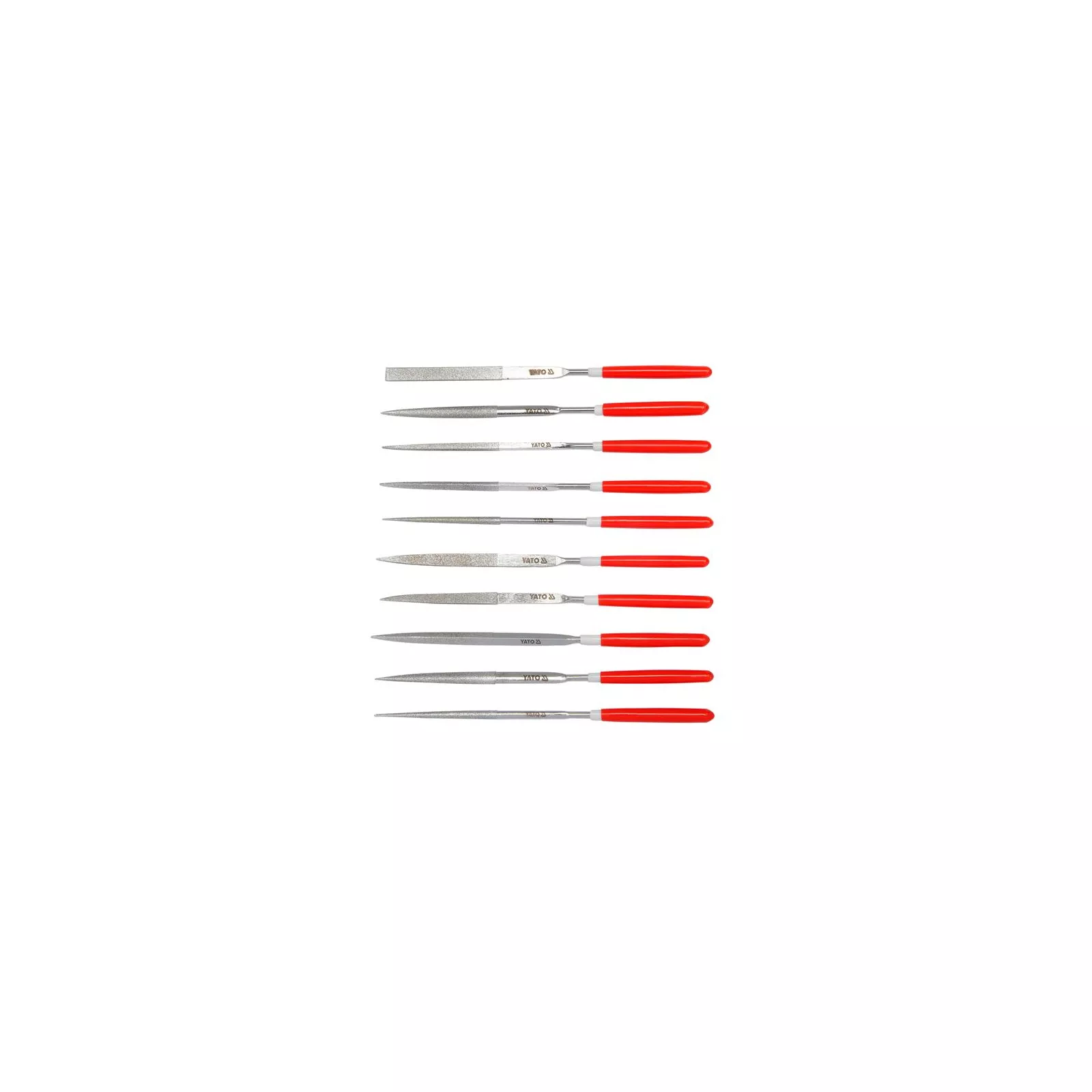 Набор алмазных надфилей Yato предназначен для тонких и ювелирных работ. Благодаря алмазному покрытию скоблите поверхность изделия, снимая его тонкий верхний слой. Миниатюрная форма надфиля позволяет работать с труднодоступными местами, обрабатывать пазы и придавать углам поверхности изделия нужную форму и вид.