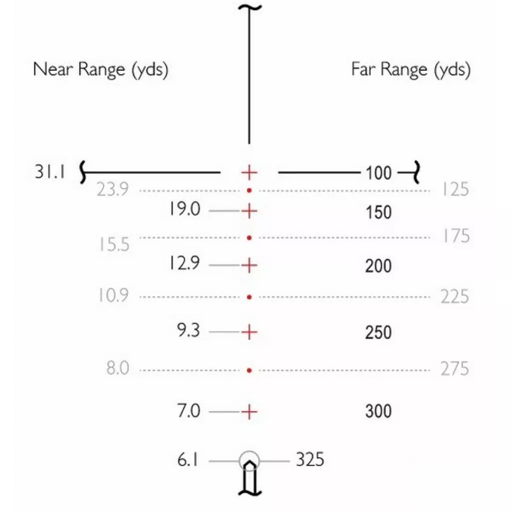 Rimfire .22 WMR - специальная сетка, разработанная компанией Hawke Optics для спортивной стрельбы и охоты на мелкую дичь. Сетка максимально точно специализирована под винтовки для стрельбы патронами кольцевого воспламенения .22 WMR (Калибр 5,7) с начальной скоростью полета пули 610 м/с, с высотой установки прицела 45 мм. Сетка имеет перекрестие типа Duplex со специальной разметкой, благодаря которой можно вести прицельную стрельбу с шагом в 25 ярдов. Единожды пристреляв прицел на расстояние 100 ярдов, с помощью данной прицельной сетки можно легко определять траекторию пули на расстоянии до 325 ярдов, что даже превышает эффективную дальность стрельбы патрона .22 WMR. Параметры данной сетки верны при максимальном увеличении 12х. Данная прицельная сетка чрезвычайно проста и удобна и может использоваться с успехом также для стрельбы из пневматического оружия. Персональную адаптацию сетки под конкретное оружие и тип снаряда позволит совершить бесплатный баллистический калькулятор X-ACT.